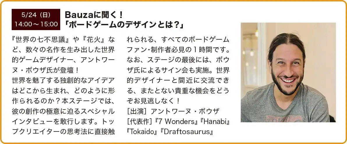 同日に京都で開催されるインディーゲームの祭典『BitSummit』の会場と中継をつなぐ、まさかの連動企画のほか、文化庁・特許庁の協力のもと「ボードゲームと知的財産権」をテーマにしたアカデミックな講演や、もはや春の恒例となった海外ゲストによるゲームデザイン論など、盛り沢山の内容でお届けします。 |