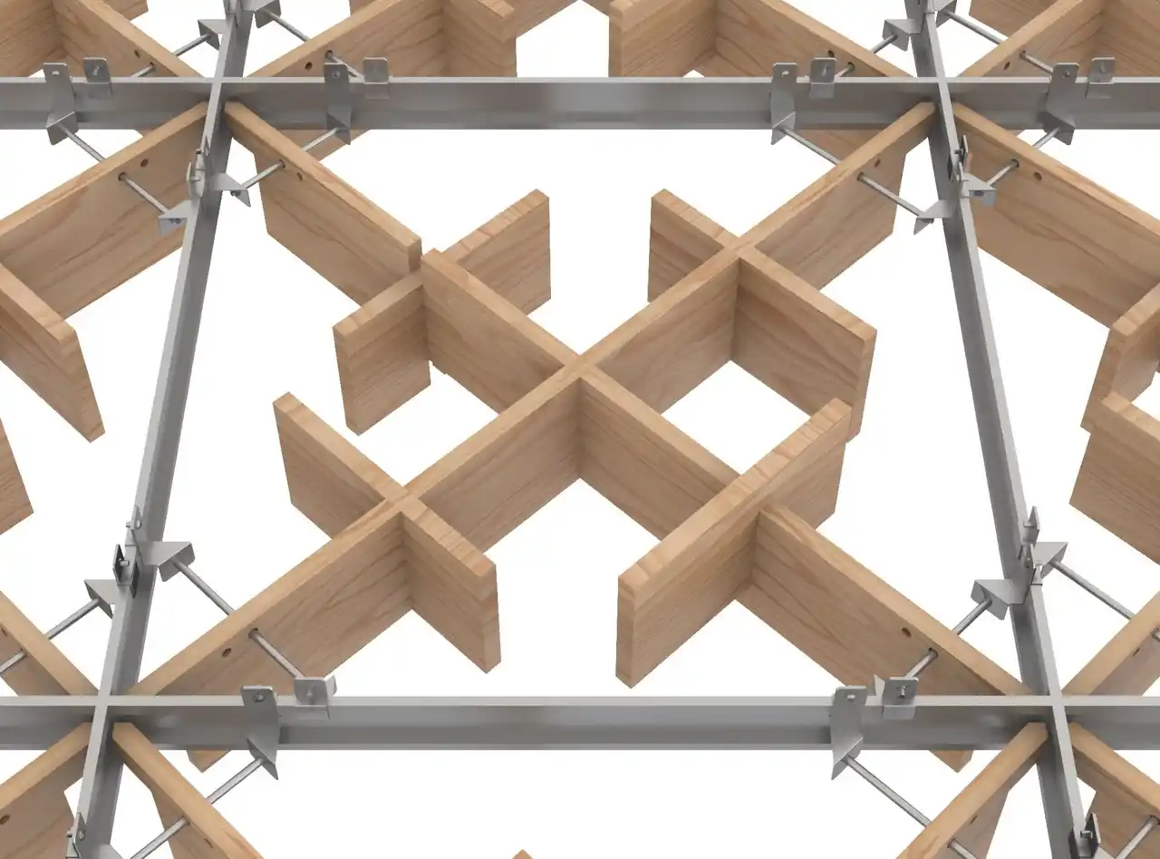 取付金具が国産木材格子ルーバーとTバーをしっかり固定 |