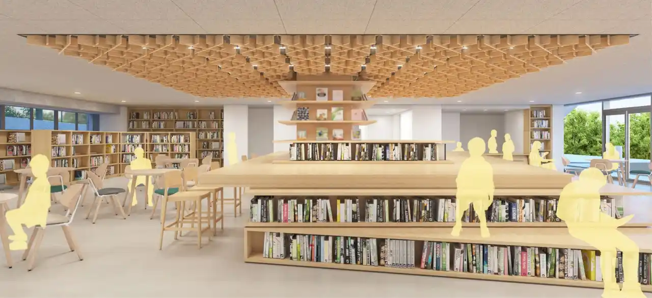 東京都内で進行中の校舎建て替えプロジェクト。特別教室が集約される新棟のライブラリーに国産木材格子ルーバーを導入し、天井の木質化を図ります。木質天井の下には自由に読書や勉強ができるファニチャーを設け、木パネルに反射したやわらかな光が児童・生徒たちの感性や情操を育む環境をつくります。2028年竣工予定。 |
