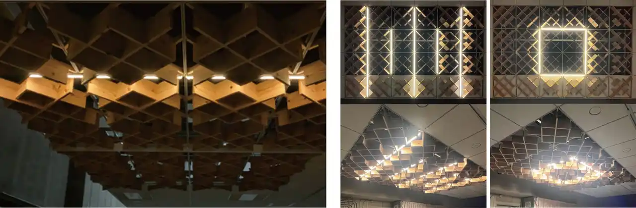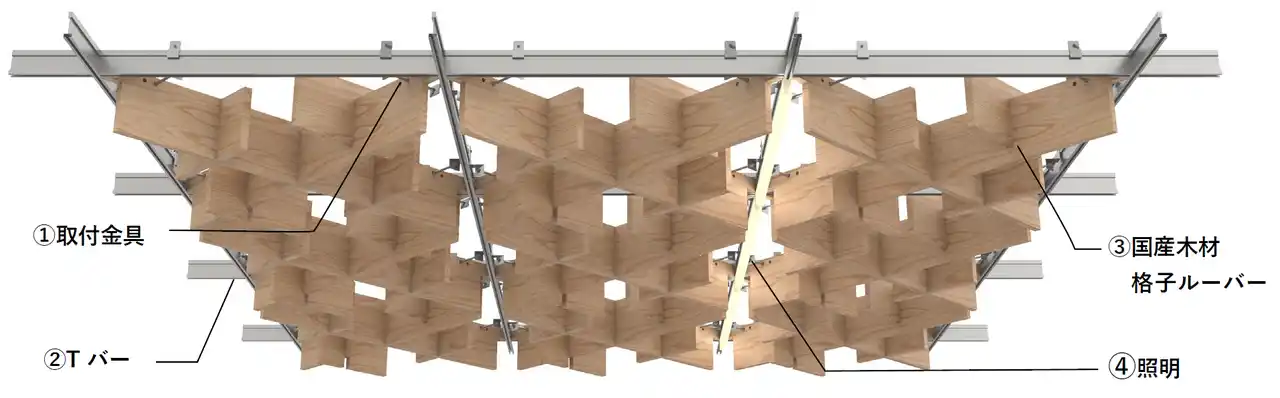 システム天井のフレームに組み込むことができる木材格子ルーバーと照明で構成 |