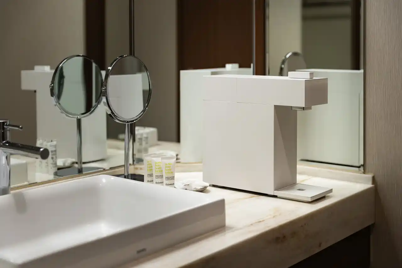 ペットボトル等使い捨て容器での提供を廃止した客室には、浄水機能を備えたウォーターサーバーを設置いたします。お客様には、必要な分だけ、いつでもご利用いただけます。 |