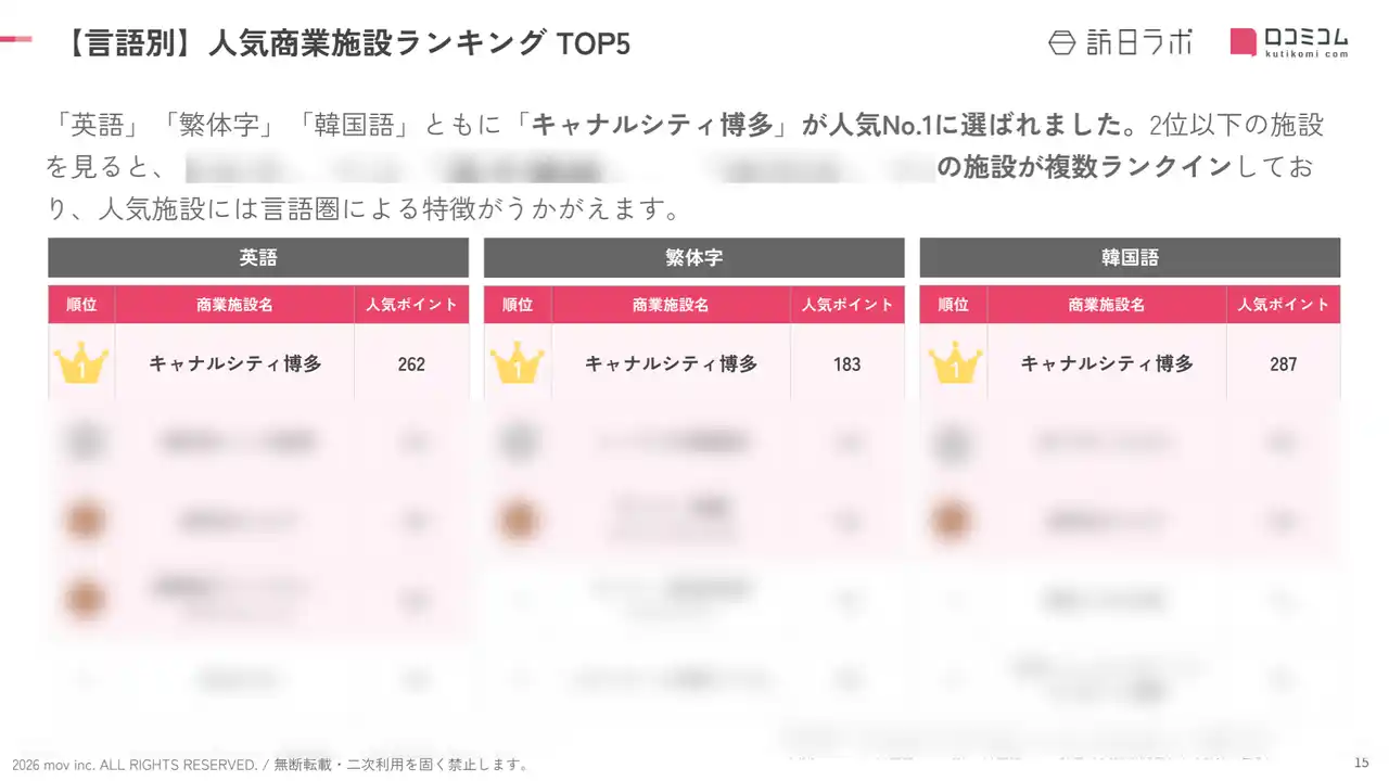 レポートでは、言語別ランキングや人気施設の口コミ分析も紹介しています。 |