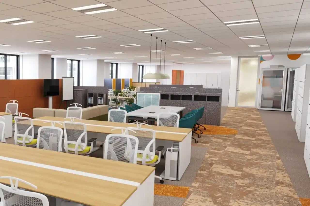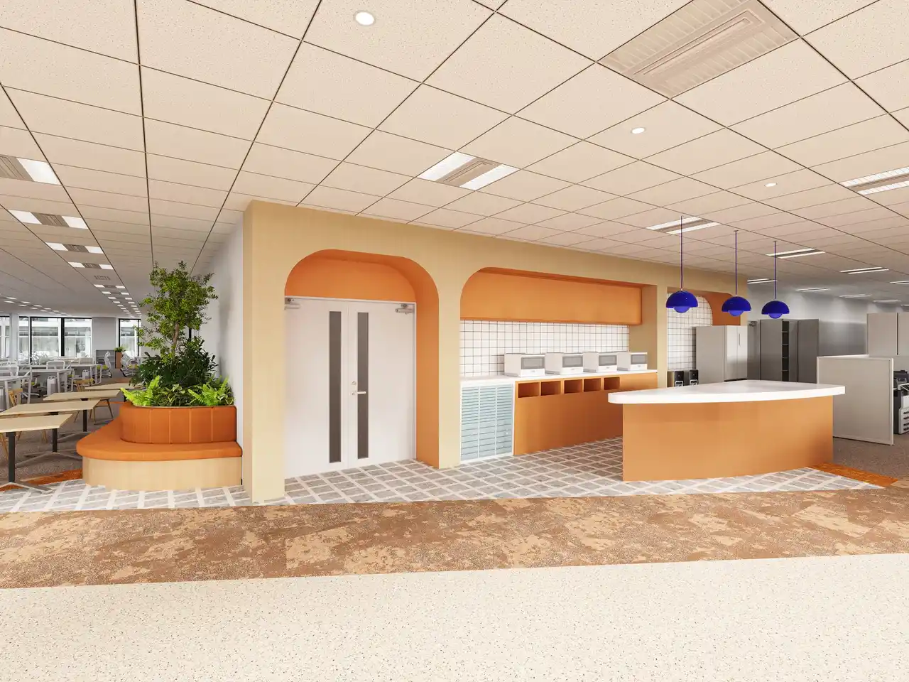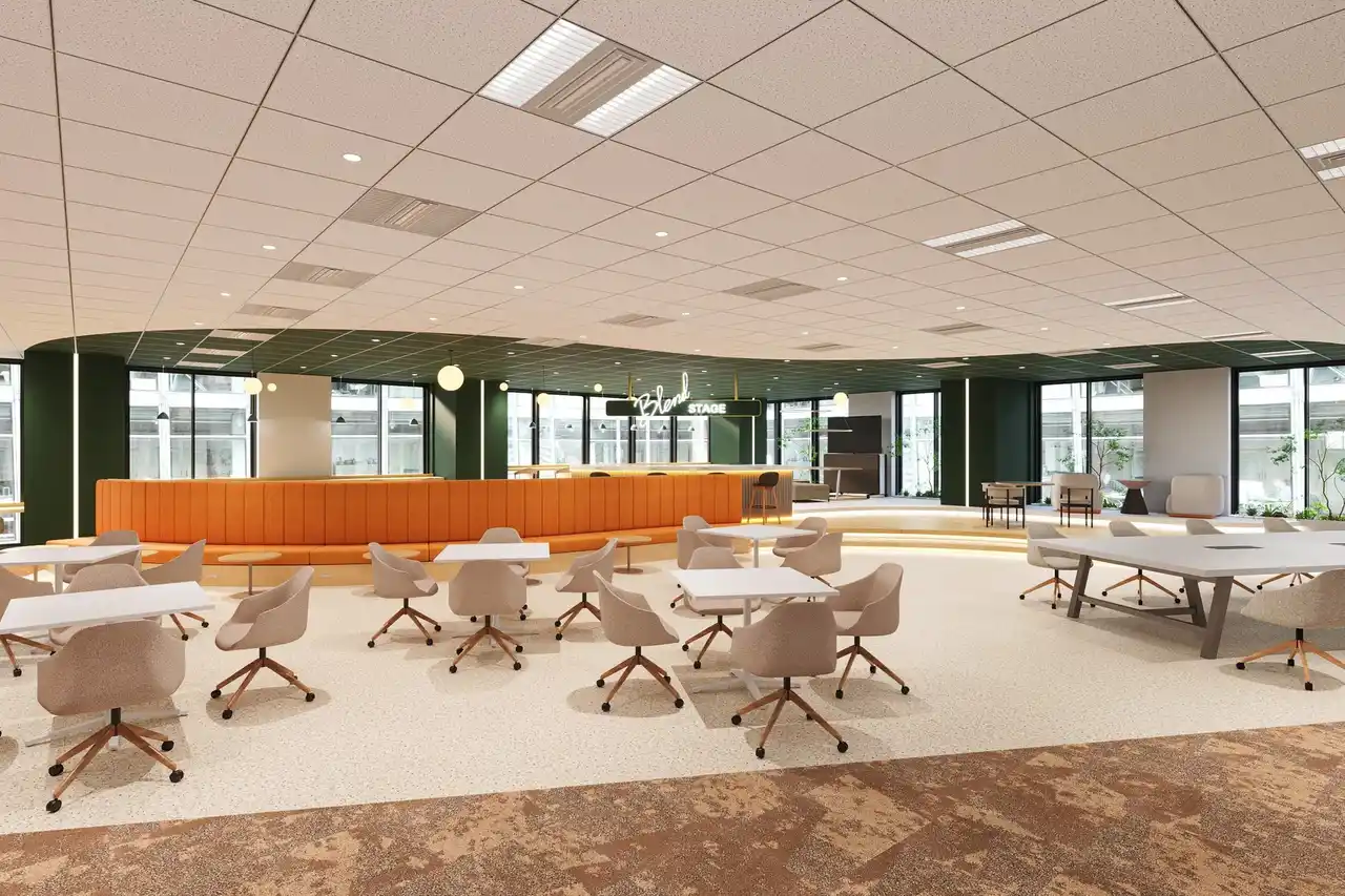 | 部門間の連携を強化し、業務効率と意思決定スピードの向上を図ります。本社機能を6フロアから1フロアに集約し、交流・発表やリフレッシュの場となる「Blend Stage」をオフィス中央に設置するとともに、各部署が自然に交わる接点となる「Blend Point」を動線上に配置します。これにより、部門を越えてすぐに相談・連携ができ、単なる情報共有にとどまらないコミュニケーションを促進します。議論やアイデア創出が日常的に生まれ、迅速な意思決定と新たな取り組みにつなげていきます。 | ||||||||||||||