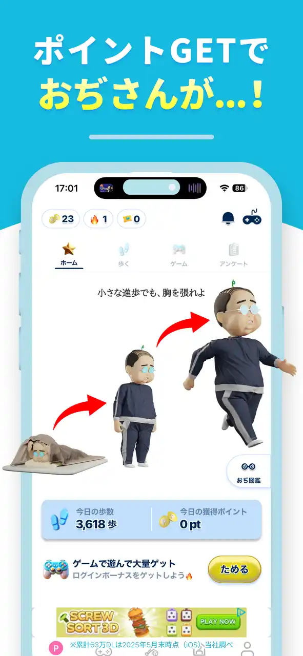 ポイント獲得を重ねることで、アプリ内の“おぢさん”キャラクターが成長していくこと |