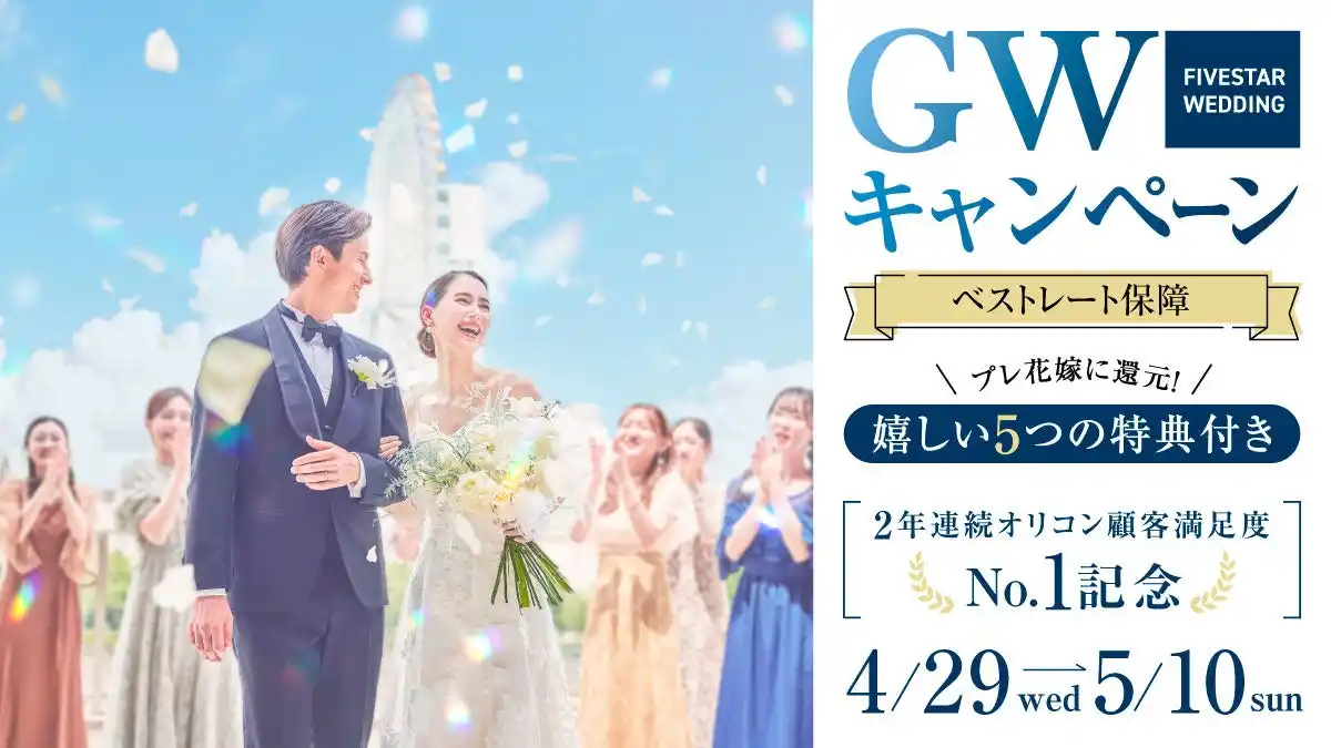 愛グループが展開する結婚式場ブランド「FIVESTAR WEDDING」は、2026年4月29日(祝・水)から5月10日(日)までの期間、ゴールデンウィーク限定キャンペーンを開催いたします。
