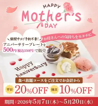 コロワイドグループの株式会社レインズインターナショナルが展開するしゃぶしゃぶ温野菜は、2026年5月7日(木)から5月20日(水)までの期間限定で、食べ放題コースが平日20%OFF、休日10%OFFとなる「母の日キャンペーン」を実施いたします。また、同期間に「アニバーサリープレート」も550円(税込)でご用意しております。この機会にぜひ、“ありがとう”の気持ちを温野菜でお届けください。 |