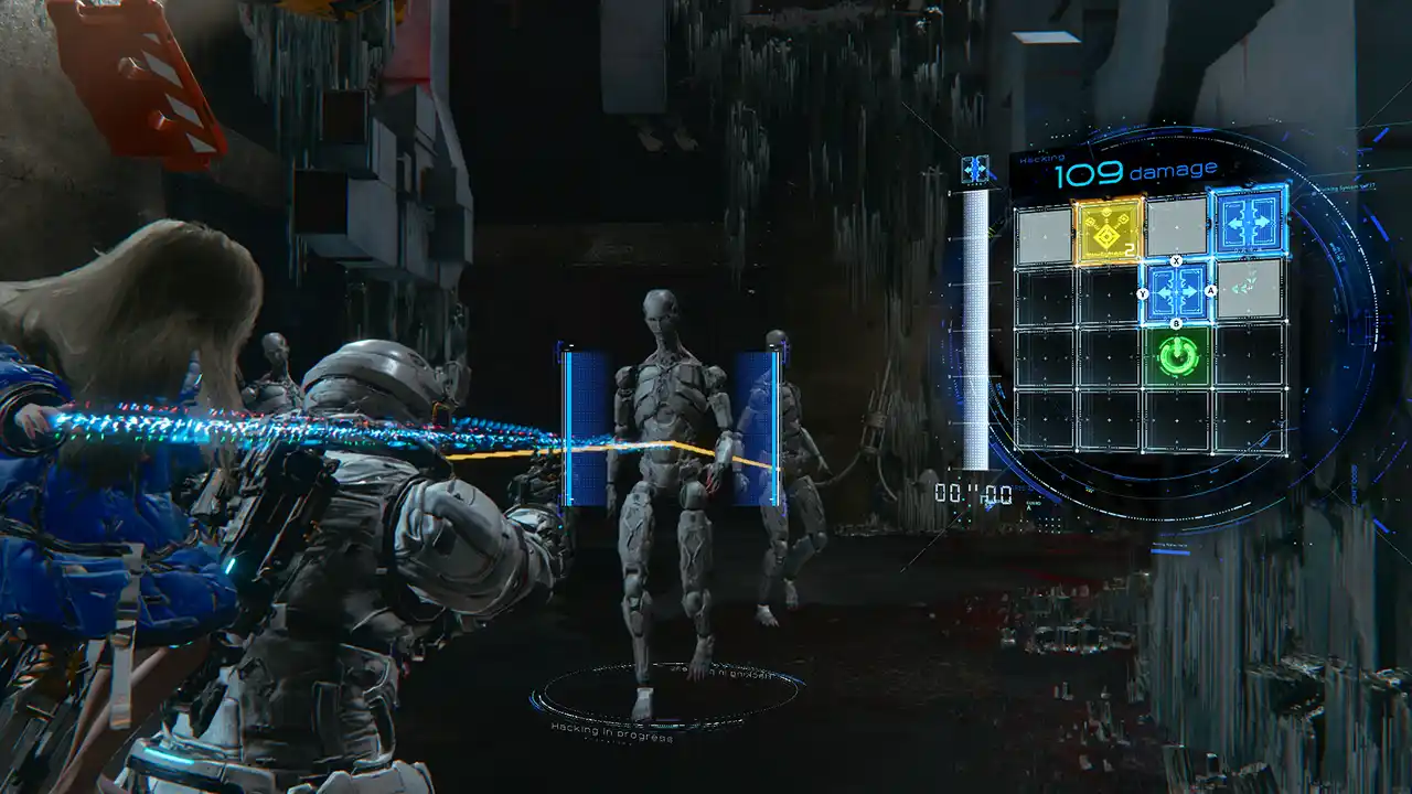 二人に襲い掛かる“ボット”たち。彼らにダメージを与えるには、ディアナの“ハッキング”で装甲を強制解除し、ヒューで銃撃を加えるのが有効だ。協力して窮地を突破せよ。 |