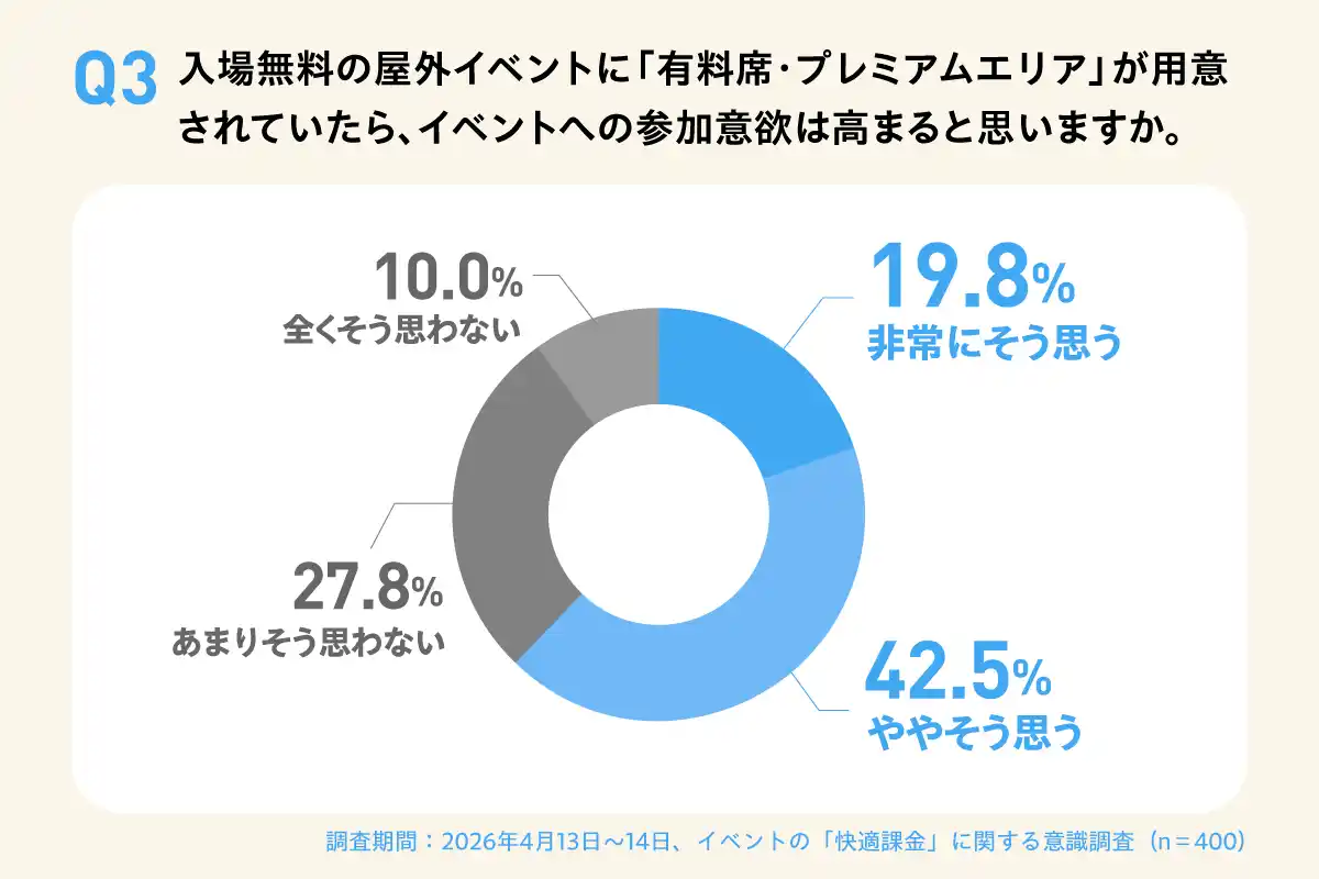 「入場無料の屋外イベントに『有料席・プレミアムエリア』が用意されていたら、イベントへの参加意欲は高まると思いますか。」と質問したところ、「非常にそう思う」「ややそう思う」を合わせて62.3%が、参加意欲が高まると回答しました。イベント自体の入場料は無料であっても、滞在中の「快適さ」や「時間効率」に対してはコストを支払ってでも確保したいという、現代的な消費行動の変化が見て取れます。 |