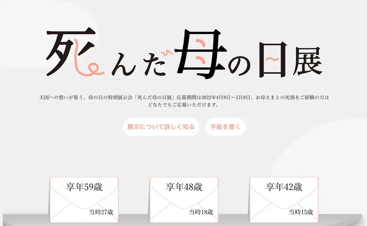 | 「死んだ母の日展」は、亡き母へ宛てた手紙を匿名で投稿・公開できるオンライン展示です。2021年の開始以来、これまでに2,000通を超える手紙が寄せられており、2026年も開催されます。 | |||