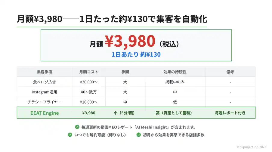 月額費用 既存MEO会社:¥30,000~¥100,000 EEAT Engine:¥3,980 |