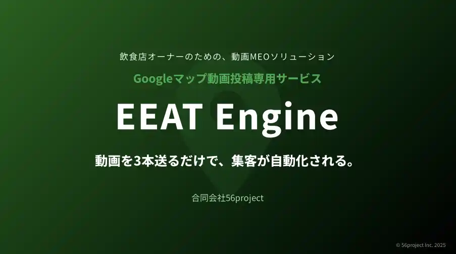 EEAT Engineは、飲食店オーナーが広告費に依存せず、Googleマップ上に売上を生み続ける複利資産を構築できる世界を作っていきます。」 (合同会社56project 代表 田中宏明) |