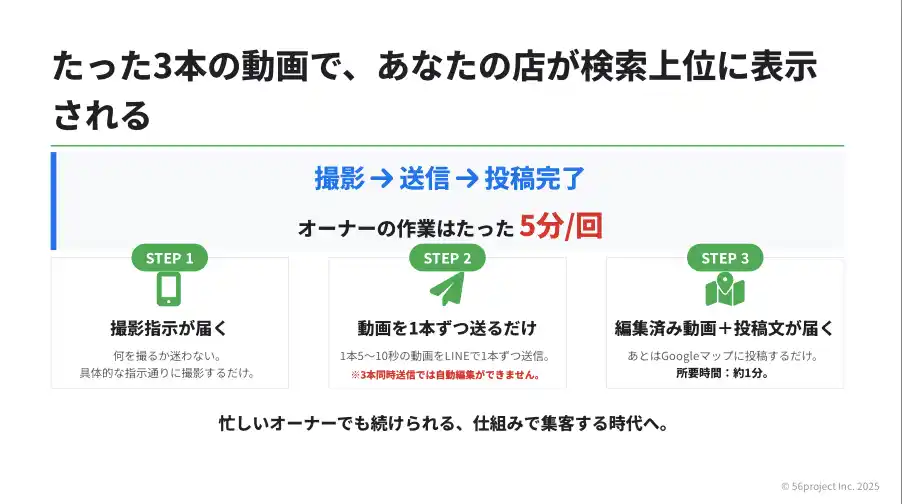 EEAT Engineは、飲食店オーナーがGoogleマップへの動画投稿を毎週継続するために開発した、LINE完結型の動画MEO自動化サービスです。 |