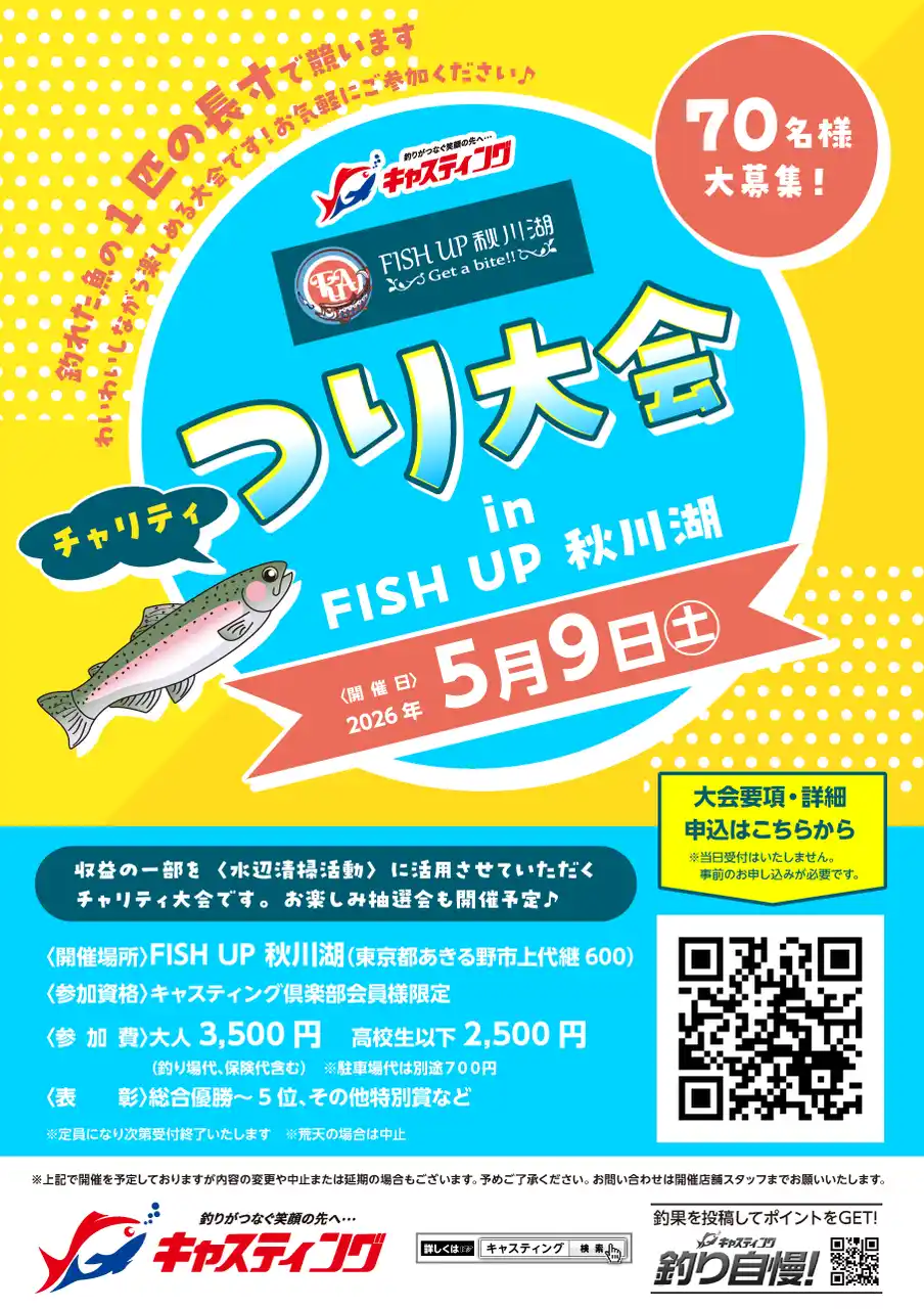 FISH UP 秋川湖の閉場後に「釣具のキャスティング」主催のチャリティー釣り大会を開催いたします。お楽しみ抽選会も開催予定で、どなたでもお気軽に楽しめます!なお、収益の一部は水辺清掃活動に活用させていただきます。 |