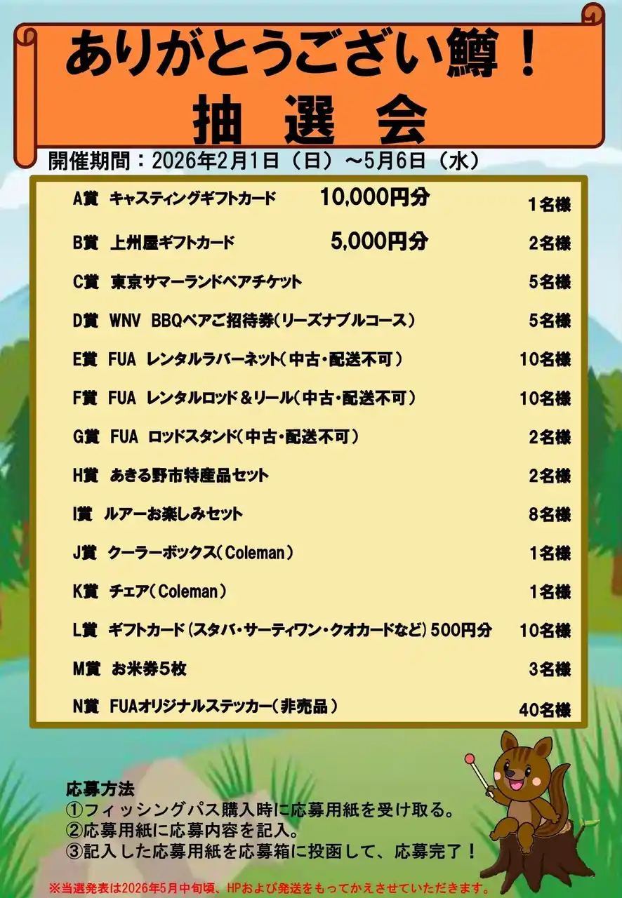 5月6日(水・祝)をもって営業終了となりますが、これまでご愛顧いただいたアングラーおよびエリアトラウト業界への恩返しとして、株式会社ワールドスポーツが運営する日本最大級の大型釣具チェーン店「釣具のキャスティング」にも協力をいただき、「FISH UP 秋川湖ありがとうキャンペーン」を実施しております。 |