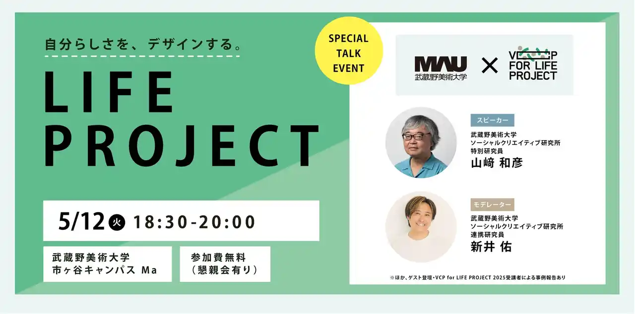 武蔵野美術大学7(所在地:東京都小平市/学長:樺山祐和)は、社会人向けプログラム「VCP for LIFE PROJECT 2026」の募集を開始します。これにあわせて、本プログラムの考え方や学びの魅力を紹介する公開トークイベント「LIFE PROJECTとは? 自分らしさを、デザインする。」を、2026年5月12日(火)に武蔵野美術大学市ヶ谷キャンパスで開催します。 |