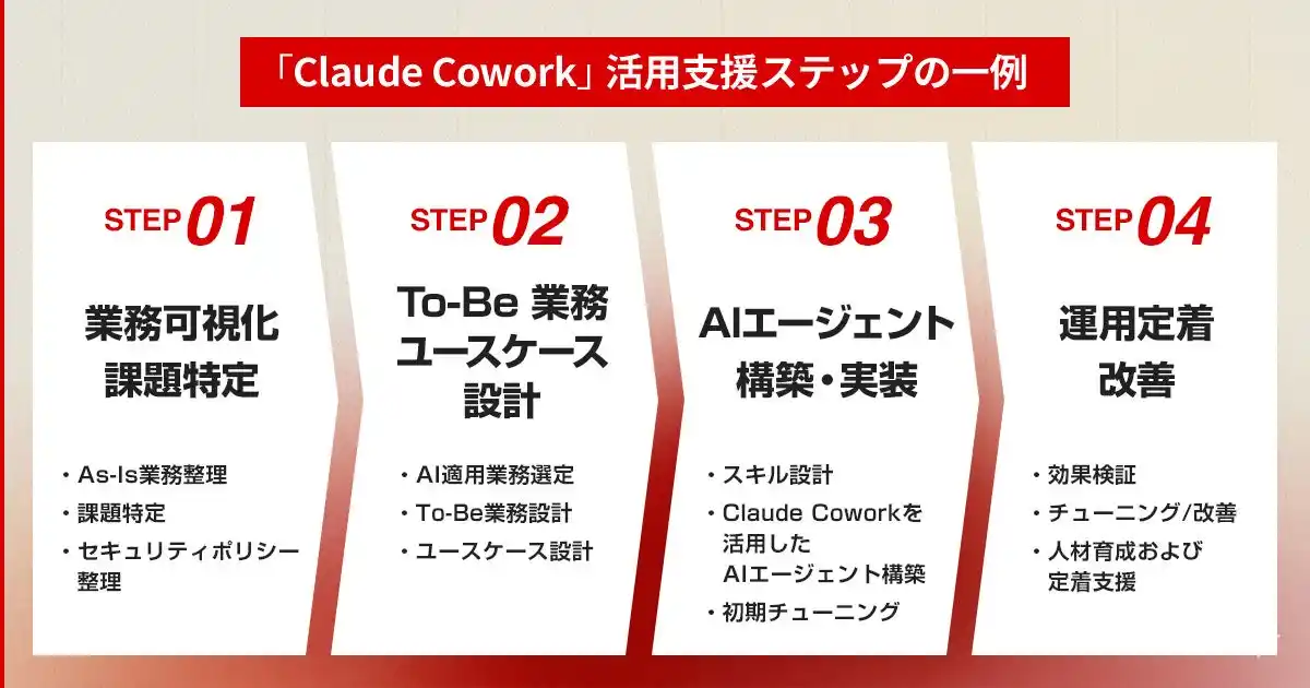 本サービスは、「Claude Cowork」および「Claude Code」を活用し、AIエージェントの設計・構築・運用改善に加え、活用人材の育成までを一気通貫で支援するものです。