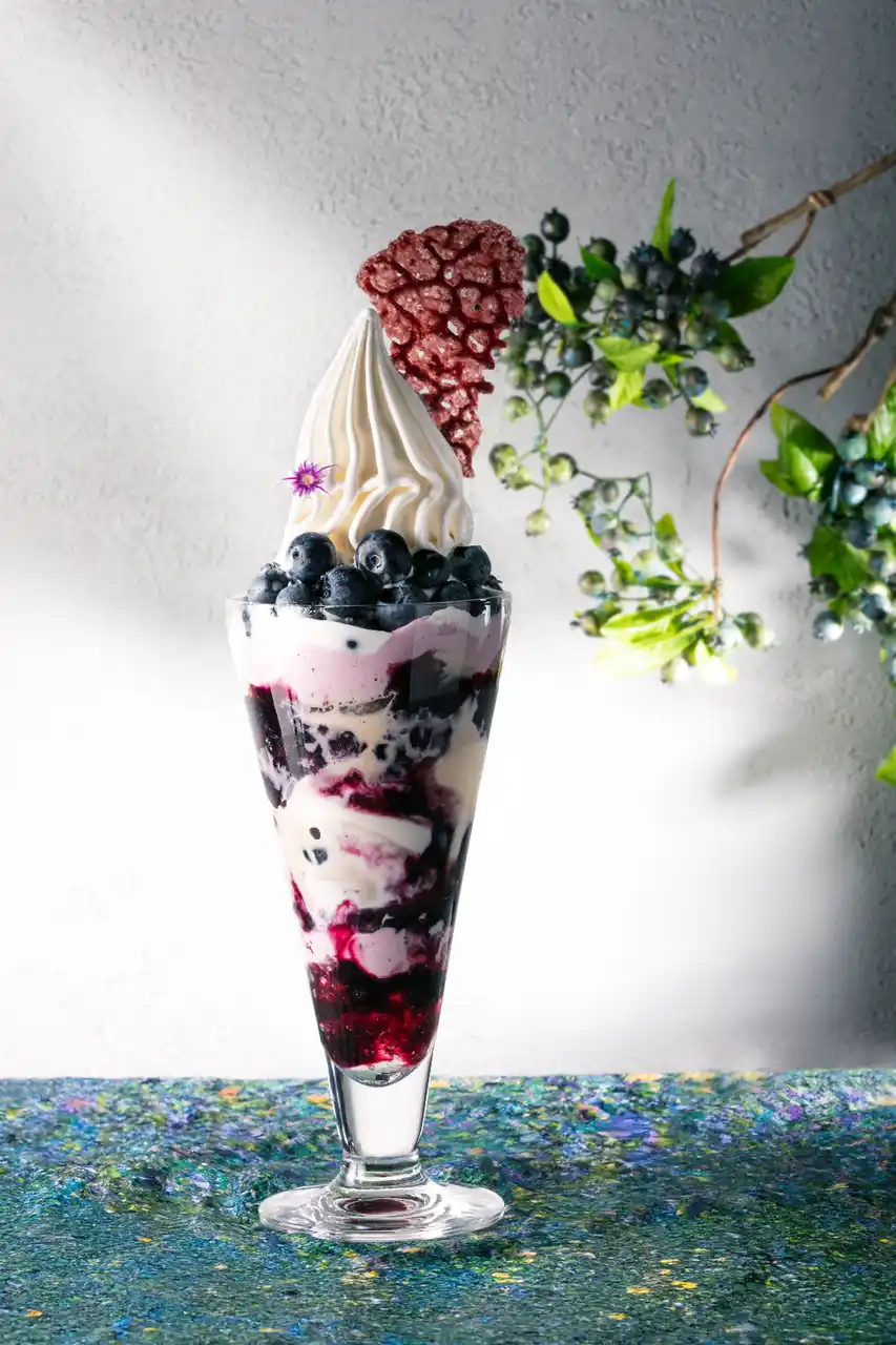■ 構成要素 (グラス上部から下に) カシスチュイル / クレミアソフトクリーム / 国産ブルーベリー / ブルーベリーシャンティークリーム / ラベンダークランブル / ラズベリーソース / ブルーベリーとラベンダーのジュレ / 紅茶のアイス / ブリュレクリーム / ブルーベリーとカシスのコンフィ / ラベンダーパンナコッタ / ココナッツソース / 国産ブルーベリー / カダイフミルクチョコレート / ヨーグルトアイスクリーム / ブリュレクリーム / ブルーベリーシャンティークリーム / ブルーベリーとカシスのコンフィ / レモンジュレ |