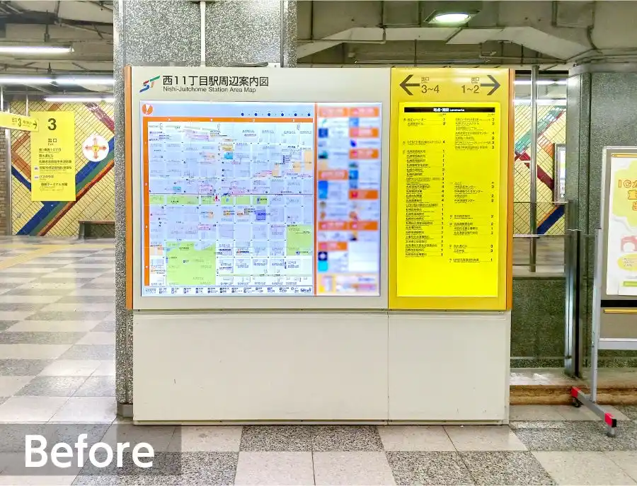 これまで設置していた白い掲示フレームから、スタイリッシュな黒色のデザインへと刷新しました。これにより、札幌市営地下鉄にある各駅の空間をモダンで洗練された雰囲気に仕上げるとともに、機能面でも改善を図りました。黒色のフレームは、照明の映り込みや反射を抑える効果があり、「ナビタ」の特徴である周辺案内地図や地域の事業者さまの広告が、より鮮明で見やすくなるというメリットが生まれます。視認性が向上することで、駅利用者がよりスムーズに目的地や地域情報を確認できる環境を整えました。 |