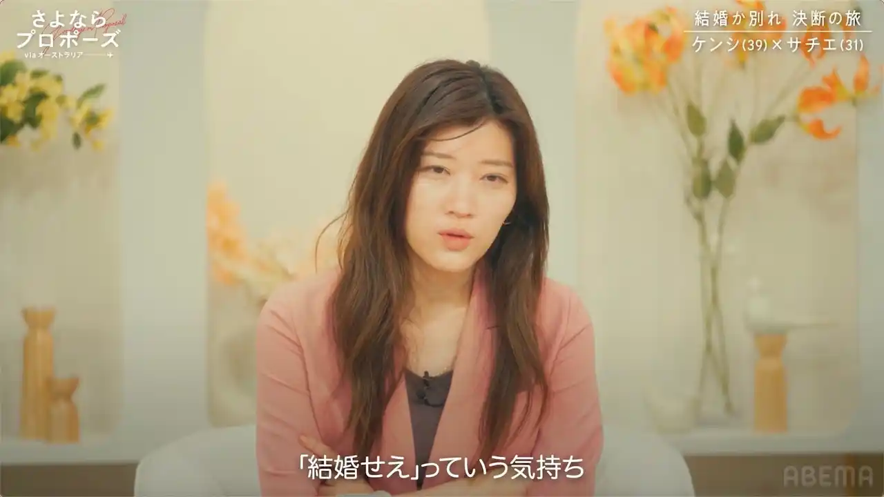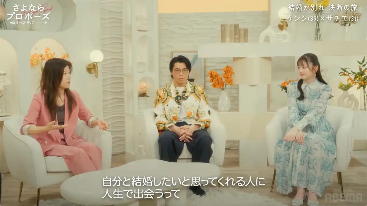 私の両親も気にかけてくれているし、結婚式もウエディングドレスも、孫の顔も見せてあげたいって私は思うのね」「だからケンシが結婚に対して足踏みしているなら私も覚悟を持って、嫌だけどお別れを選ぶしかないのかなって」と主張し、「好き同士なのになんで結婚できないの?」「“結婚”っていうワードがすごいストレスだった、結婚してない私が悪い、指輪を返した私が悪いみたいな。そう言われているみたいで、めっちゃ苦しかった」「ケンシが3回目の結婚をしても、後悔しないような結婚生活を私は送りたいと思ってる」と過去の葛藤と今後の決意を涙ながらに吐露。対するケンシは「好きという気持ちだけじゃ結婚生活が続かないのをわかっているから…踏み切る自信がない」と苦しい胸の内を明かしました。 |