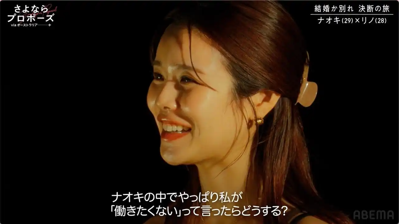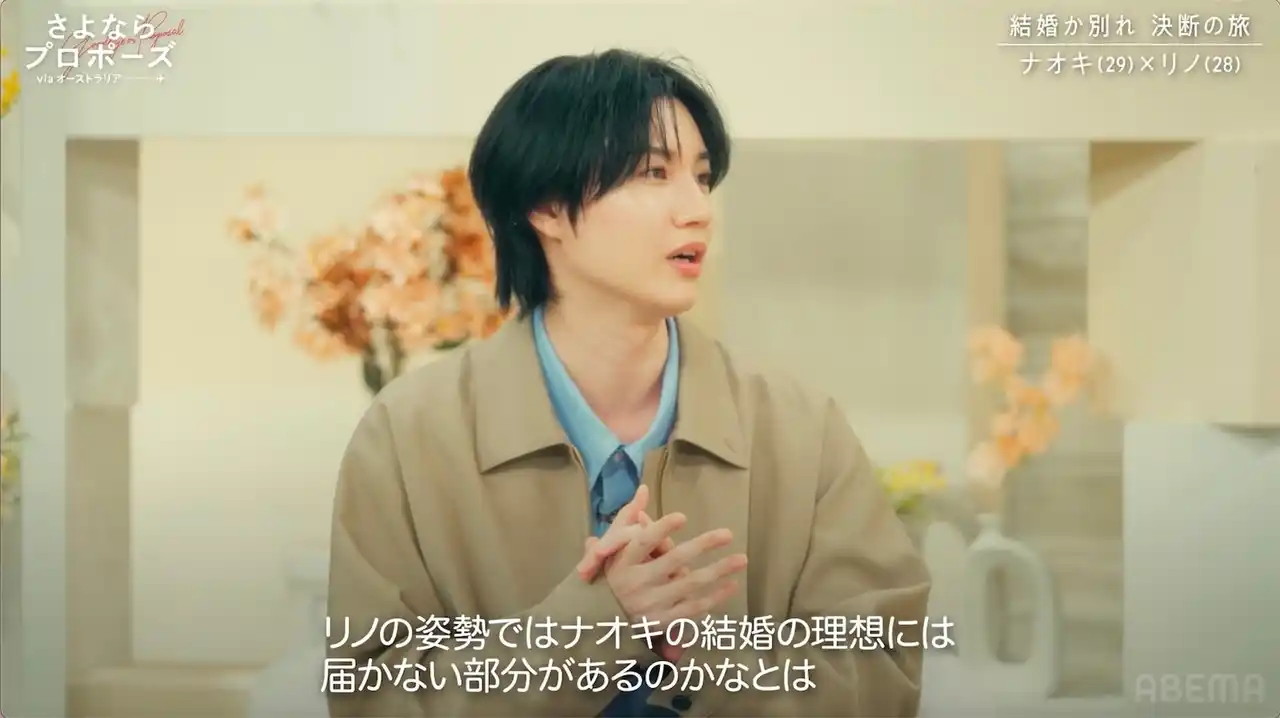 この2人を見た桜田通は、「ナオキくんは、一緒に寄り添っていきたいっていうリノさんの姿勢も見たいのかなって思う。たとえばナオキくんが身体を壊しちゃったりして、(リノが)働かなきゃいけなくなった時に社会との繋がりがなかったらどうなるんだろうとか、そういうところまで考えた上でナオキくんが発言しているんだとしたら、ちょっとリノさんの姿勢ではナオキくんの結婚に対する理想には届かない部分があるのかな」と冷静に分析し、スタジオからは納得の声が上がりました。 |