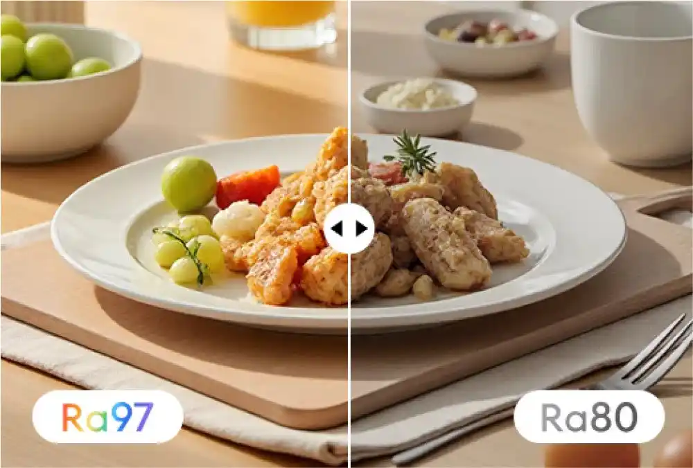「どんよりした天気や室内光で、せっかくの『料理』や『インテリア』がくすんで見える」という不満を解消するため、世界最高水準の色彩再現性(Rf97 / Rg102)を紹介。 |