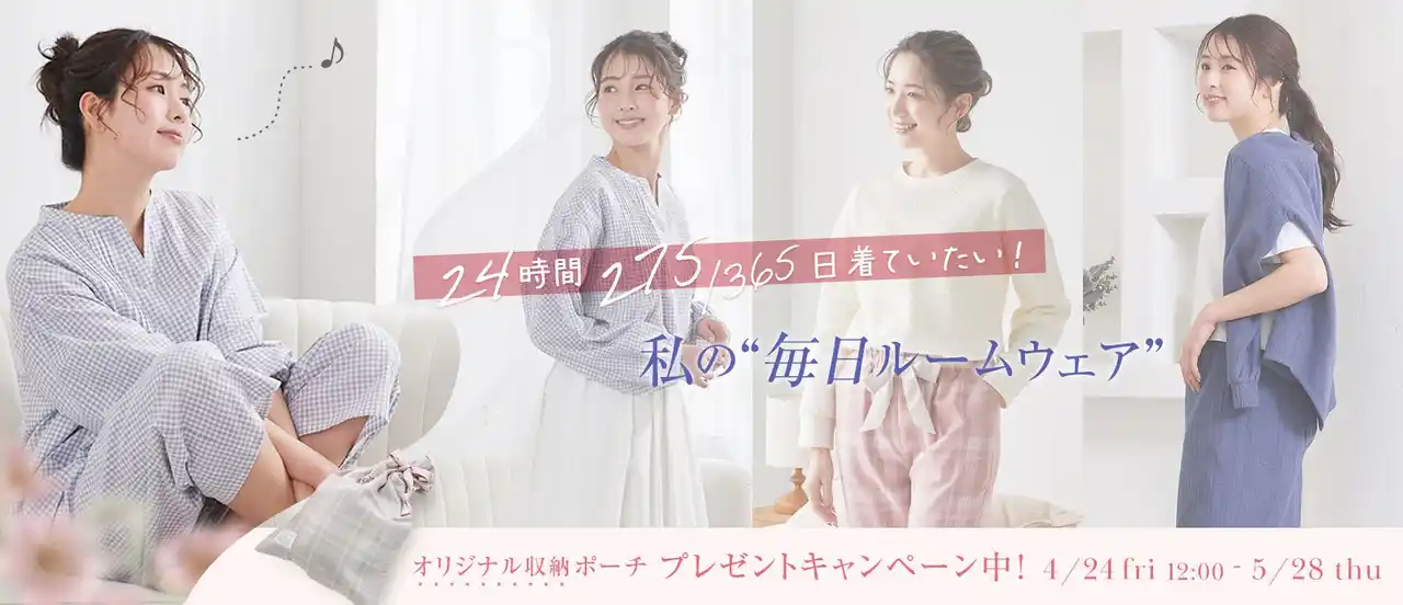 期間中にフェア対象商品をご購入でチェック柄が可愛いオリジナル収納ポーチをプレゼント!フェア特設ページでは、これ以外にも”24時間275/365日着られるルームウェア”を紹介しています。 |