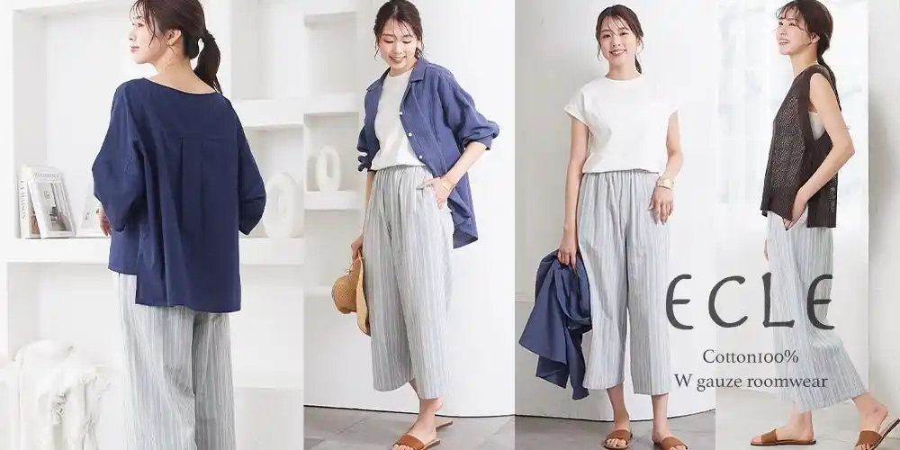 洗うほどに熟成していくダブルガーゼルームウェアの「Ecle(エクレ)」は、たっぷりとった身ごろやランダムストライプのワイドパンツが涼し気でおしゃれ。トップスは無地のブラウスとして、ボトムスはトップスを変えて様々なシーンで活用できます。着心地抜群なので、これからの季節多くなる旅行のお供としてもおすすめです。 |