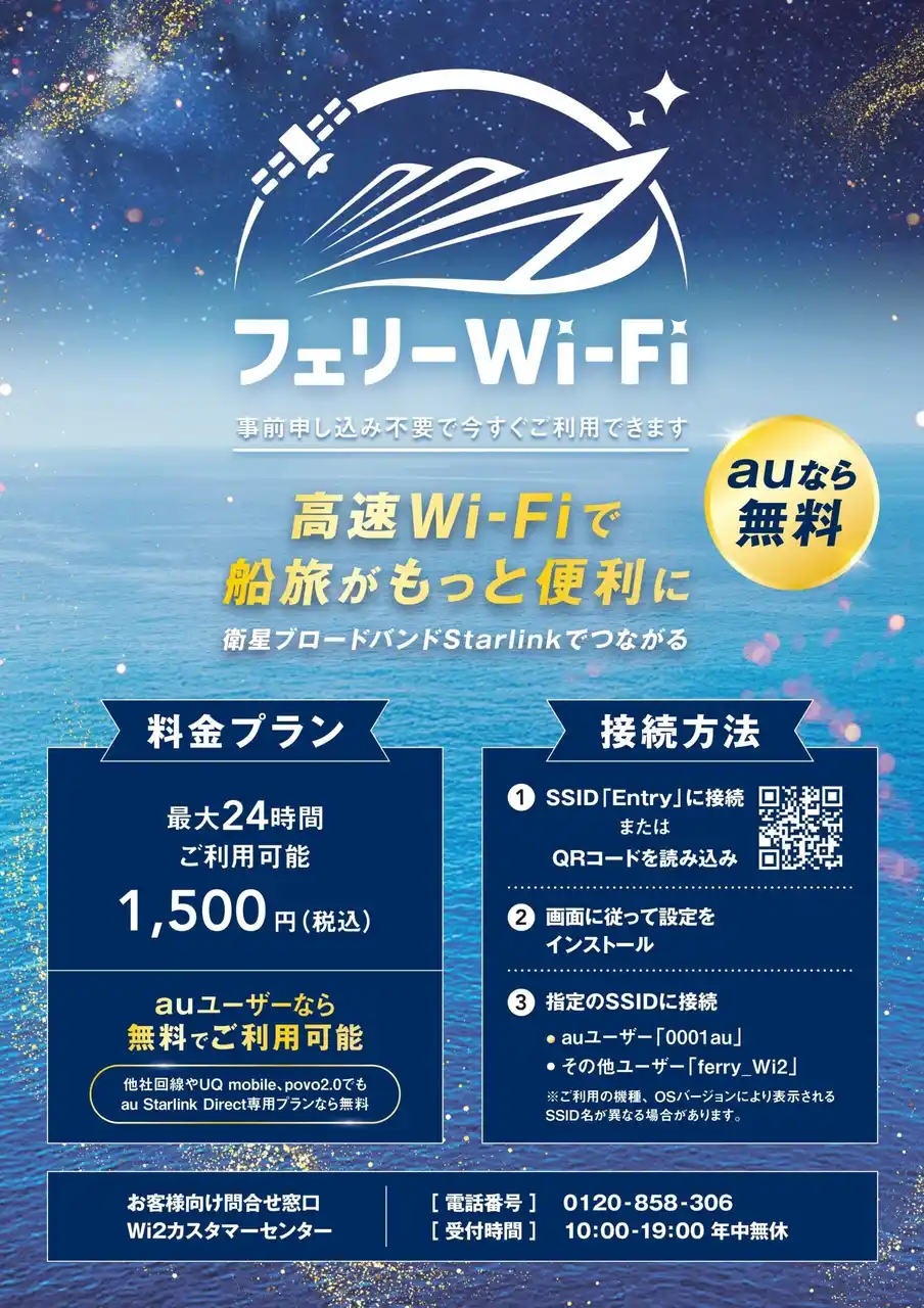3.料金 auをご利用中/au Starlink Direct専用プラン+にご加入のお客さま:無料 その他のお客さま:1,500円(24時間) ※「au Starlink フェリーWi-Fi」はKDDI株式会社・株式会社ワイヤ・アンド・ワイヤレスが提供するサービスです。本サービスをご利用の場合は、お客さまとKDDI株式会社・株式会社ワイヤ・アンド・ワイヤレスとの直接のご契約となります。 |