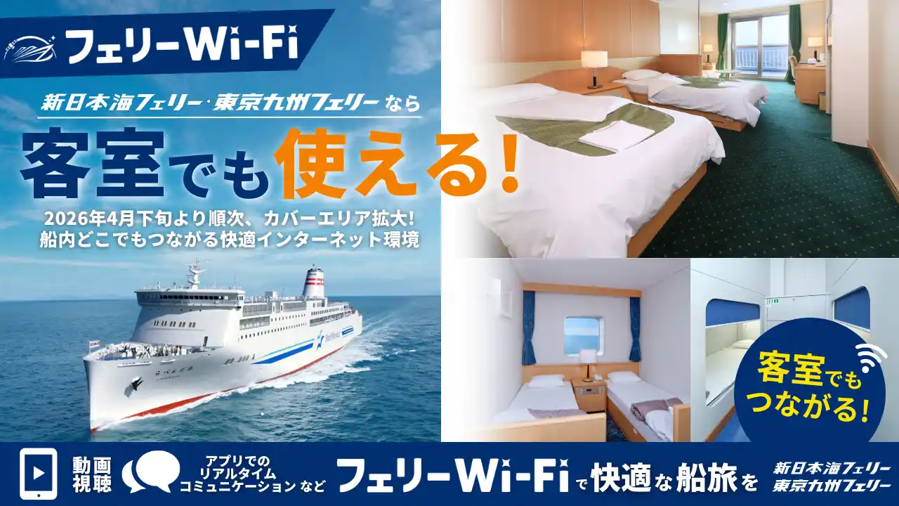 | 新日本海フェリーおよび東京九州フェリーでは、KDDI株式会社および株式会社ワイヤ・アンド・ワイヤレスが提供する船上Wi-Fiサービス「au Starlink フェリーWi-Fi」の提供エリアを拡大し、全客室でご利用いただけるサービスを開始いたします。 | |||