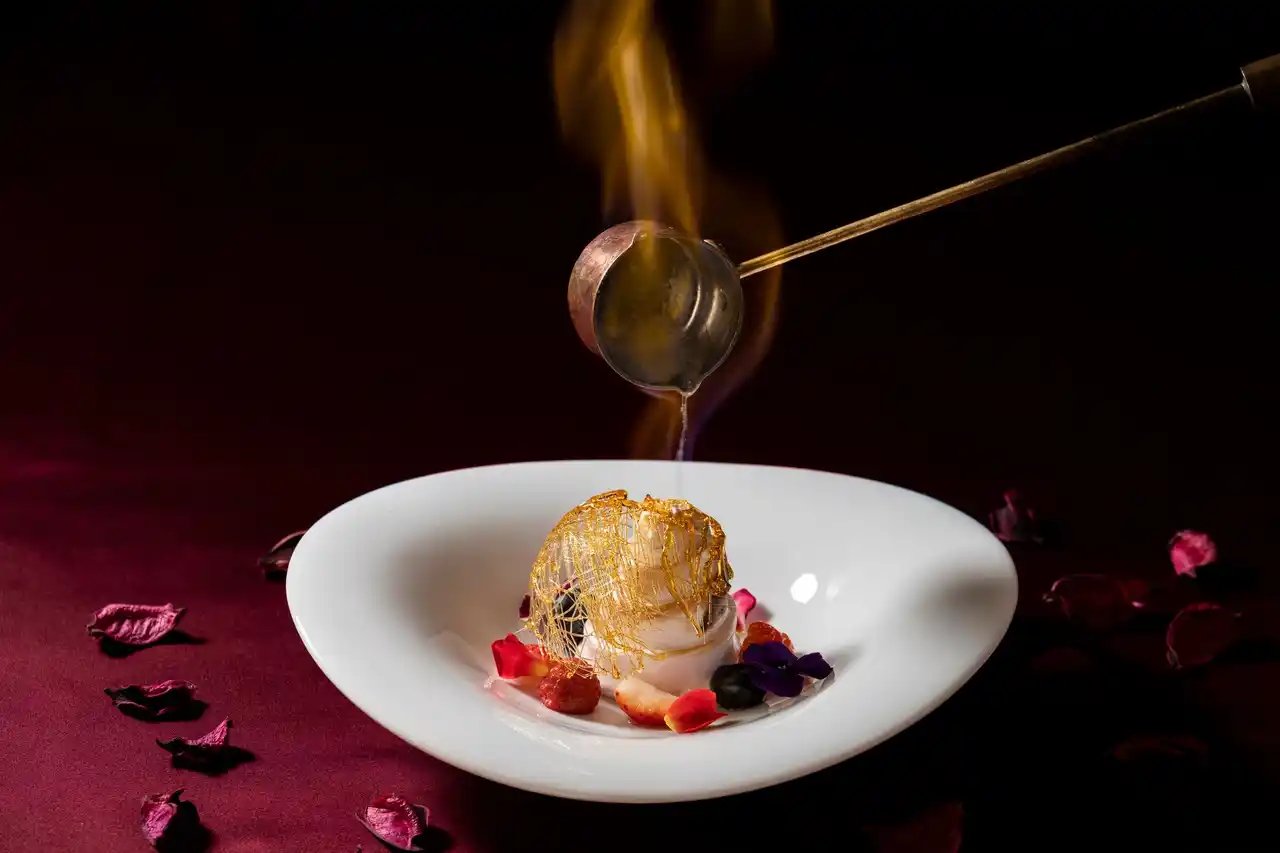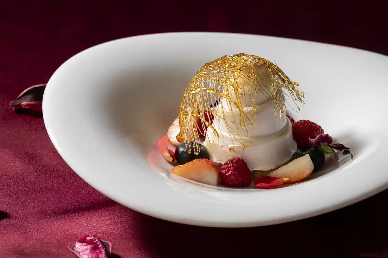 南国の恵みを贅沢に閉じ込めた、華やかなベイクドアラスカ。濃厚な甘みのマンゴーアイスと香ばしいココナッツクッキーを、軽やかな口どけのメレンゲで包み込みました。仕上げにはオレンジリキュールを用いて、目の前でフランベし、立ち上る芳醇な香りがデザート全体を優雅に引き立てます。トロピカルな素材が織りなす味わいと、炎の演出が生み出す特別なひとときをお楽しみいただける一皿です。 |