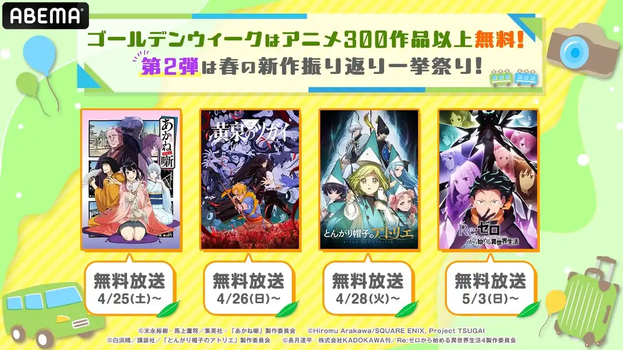 新しい未来のテレビ「ABEMA」は、ゴールデンウィーク特別企画「アニメ300作品以上無料大放出祭」の一環として、2026年4月25日(土)より、新作春アニメ40作品超の無料振り返り一挙放送を実施いたします。 |