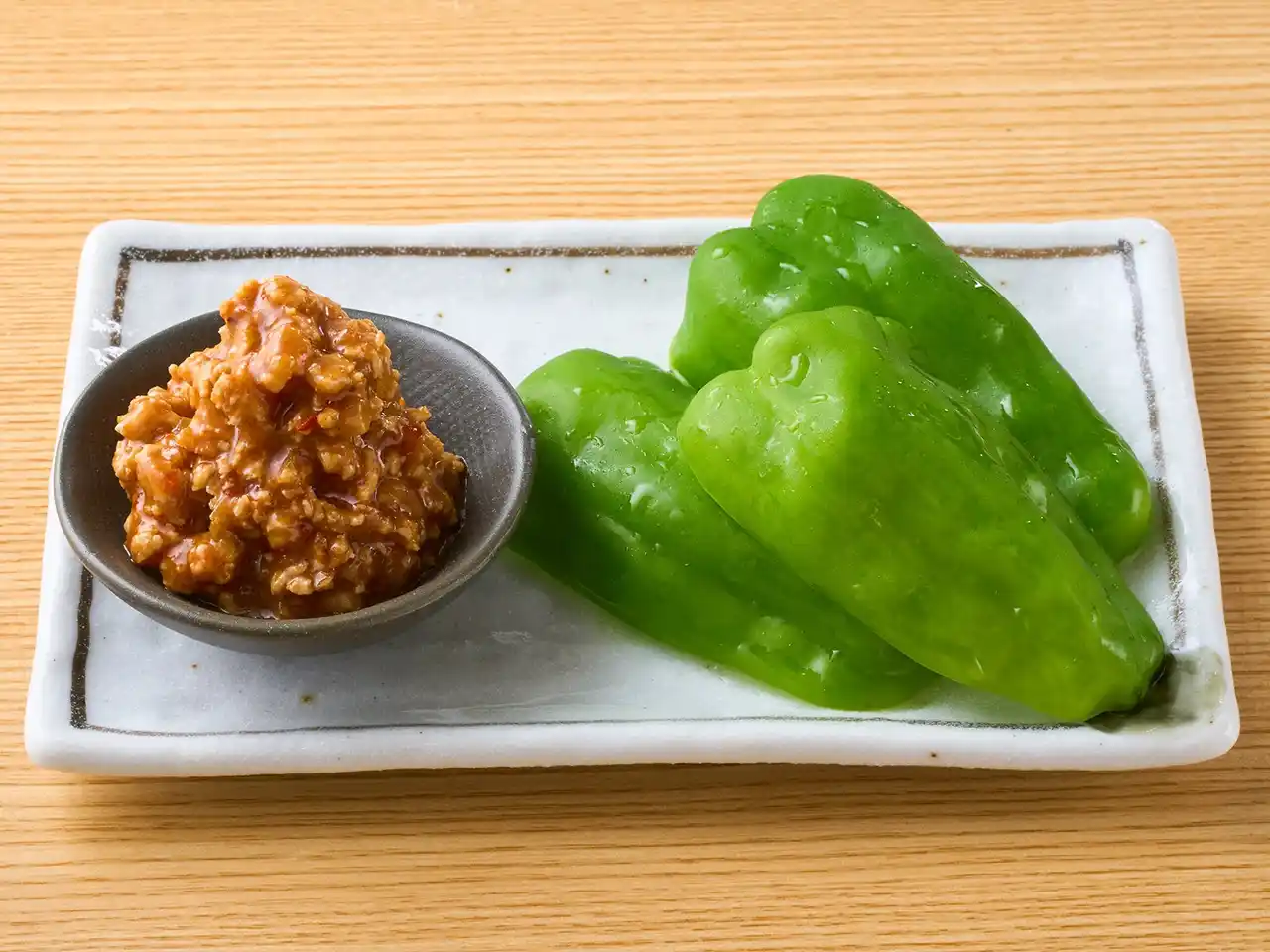 ☆お酒がススム一品3. 手作りの鶏肉味噌を使った「肉味噌パリパリピーマン」399円(税込439円) |