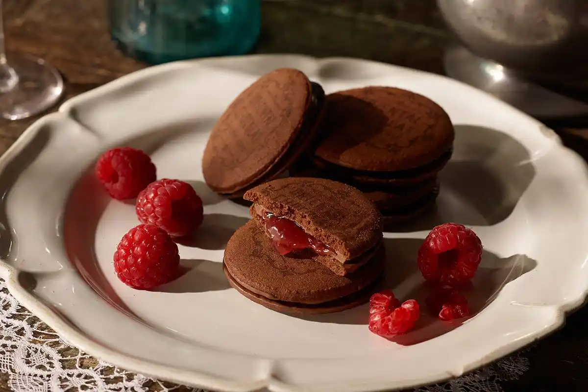 風味豊かなラズベリーソースを、ミルクチョコレートでコーティングし、ココアクッキーでサンドした、贅沢な味わいのサンドクッキーです。 |