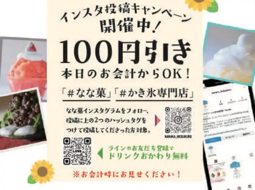 『なな菓』では、公式インスタグラムアカウントをフォローし、「#なな菓」、「#かき氷専門店」の2つのハッシュタグをつけて投稿してくださったお客様に、当日のお会計の総額から100円をお値引きするインスタグラムキャンペーンを開始いたしました。下記の詳細をご覧の上、ぜひご利用ください。 |