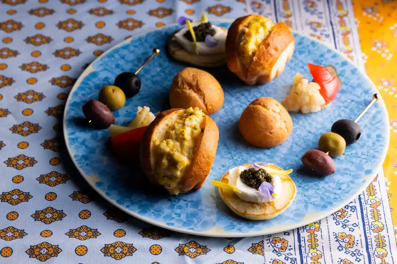 【上段】フィンガーバイツ:キャビア&ブリニ、トリュフエッグサンド、パルミジャーノグジェール、ドライフルーツ/オリーブ/ナッツ |