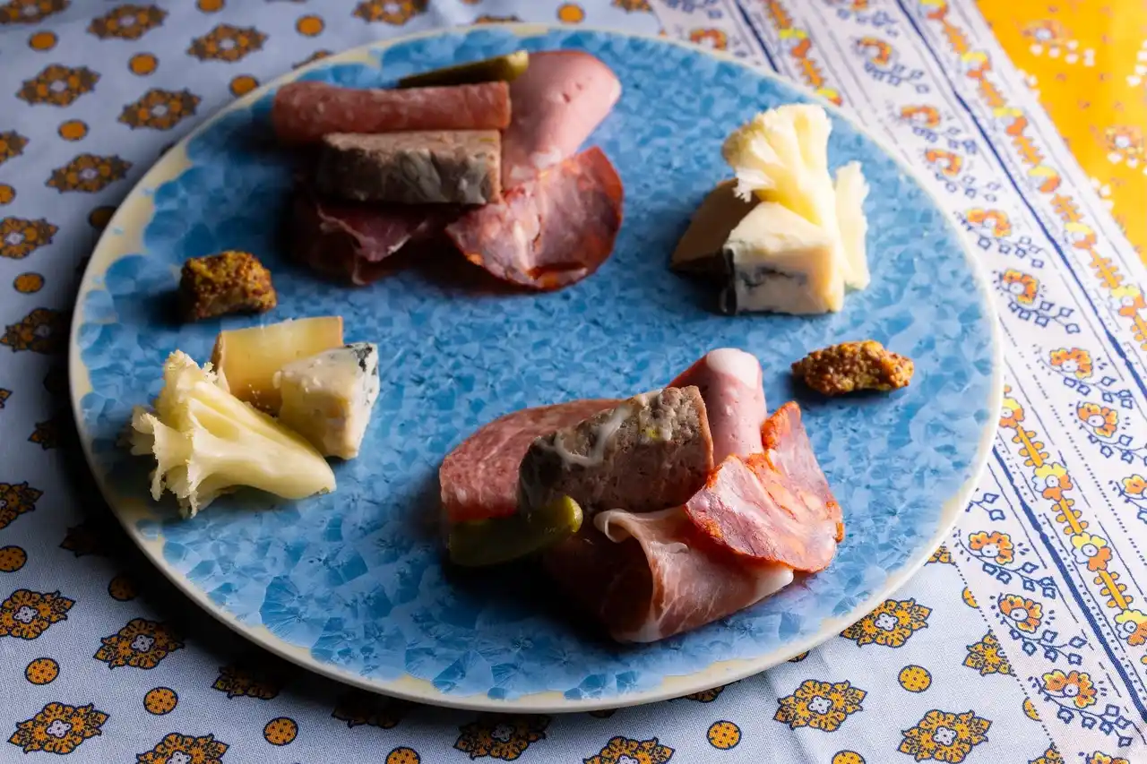 【下段】シャルキュトリー&フロマージュ:パテドカンパーニュ、生ハム&サラミ、自家製ピクルス、粒マスタード |