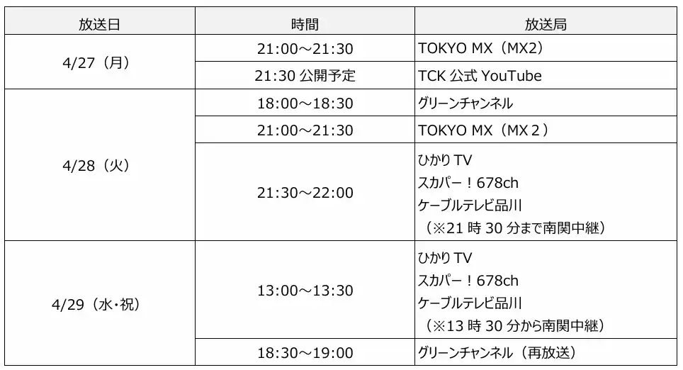 | 本番組は、4月27日(月)のTOKYO MX(MX2)を皮切りに羽田盃当日(4/29)までスカパー!678chやグリーンチャンネルなどで放送されるほか、TCK公式YouTubeでも公開からいつでもご覧いただけます。 | |||