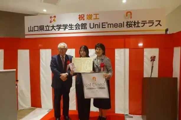 UniLife(ユニライフ)のブランドで全国の学生マンションの企画開発・仲介斡旋・運営管理までをトータルで行う株式会社ジェイ・エス・ビー(本社:京都府京都市、代表取締役社長:森 高広 以下、当社)は、公立大学法人山口県立大学(以下、山口県立大学)の南キャンパス(山口市桜畠)構内にて、食事付き学生マンション「山口県立大学学生会館 Uni E'meal 桜杜テラス(ユニエミールサクラモリテラス)」の運営を4月1日より開始しました。開設に先立ち山口県立大学と共に3月6日に開催した竣工式では、建物名称の学内公募で選ばれた受賞者への表彰も執り行われました。 |