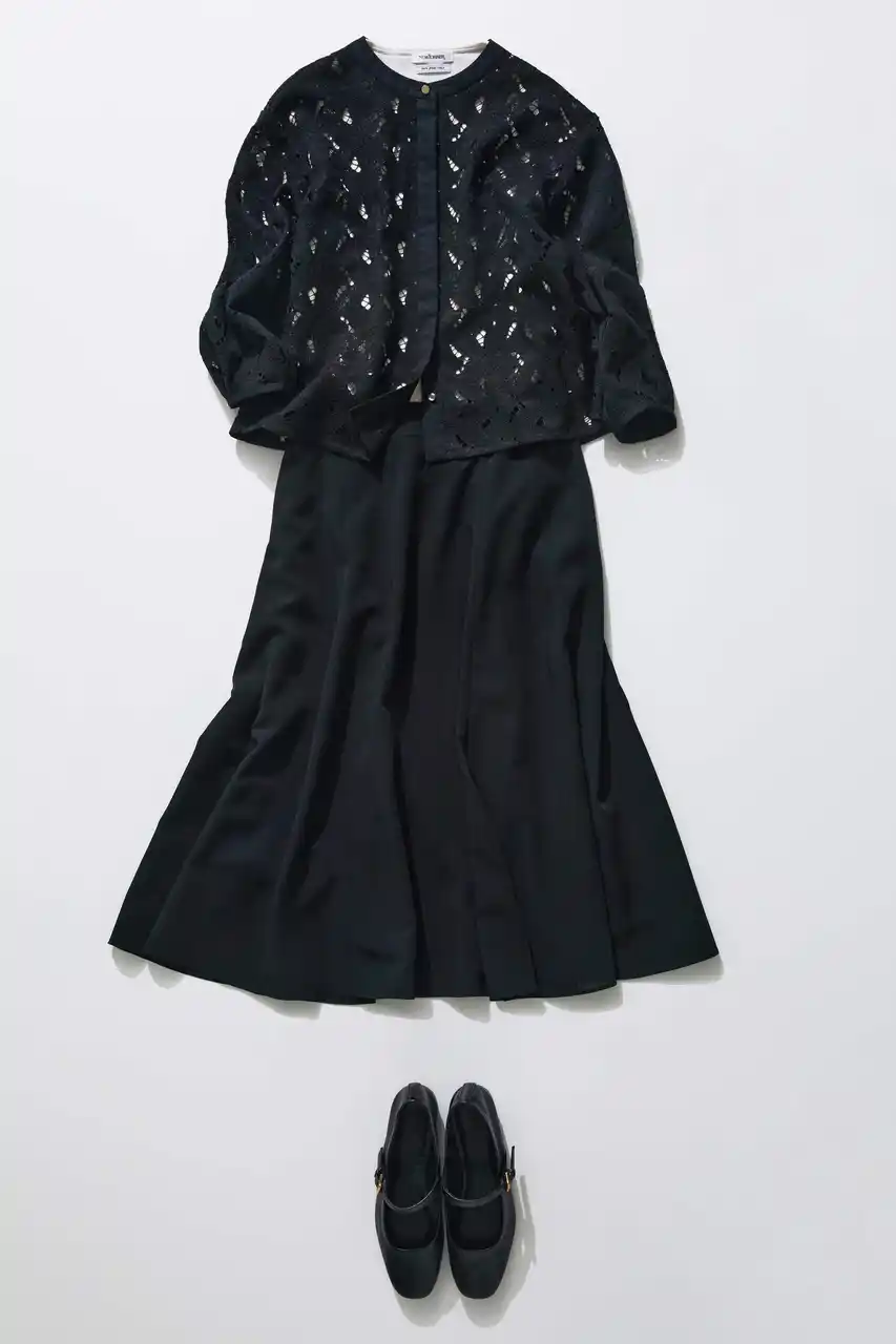 | ブラックのスタイルにさらりと羽織り、シックにまとめて。ベージュのラメニットを差し込むことで、奥行きとさりげない華やぎをプラス。透け感のあるレースが軽さを添え、シーンにふさわしい上品さを演出。 | ||||||||