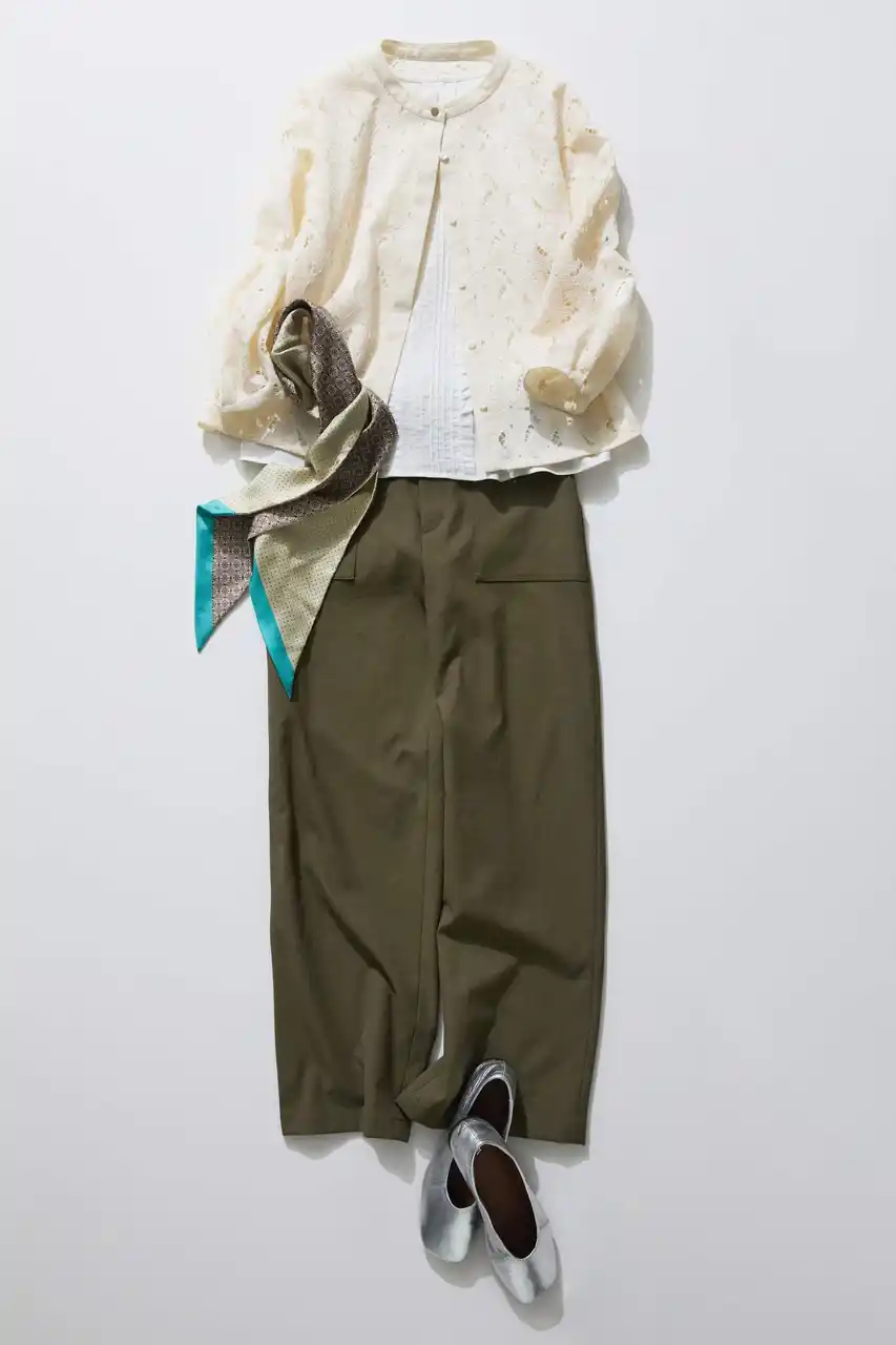 | ホワイトのレースブラウスに、カーキパンツを合わせたナチュラルな配色。シンプルなインナーで、レースの表情を引き立てて。肩の力を抜いた、大人のリラックススタイルへ。 | ||||||||