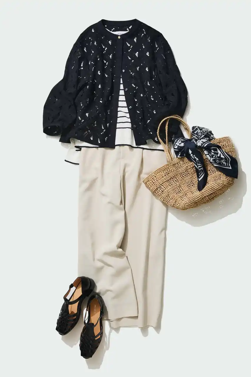 | ブラックのレースにボーダーカットソーを重ねた、軽やかなレイヤード。ベージュパンツで全体をやわらかく中和して。きれいめをキープしながら、こなれた印象に仕上がります。 | ||||||||