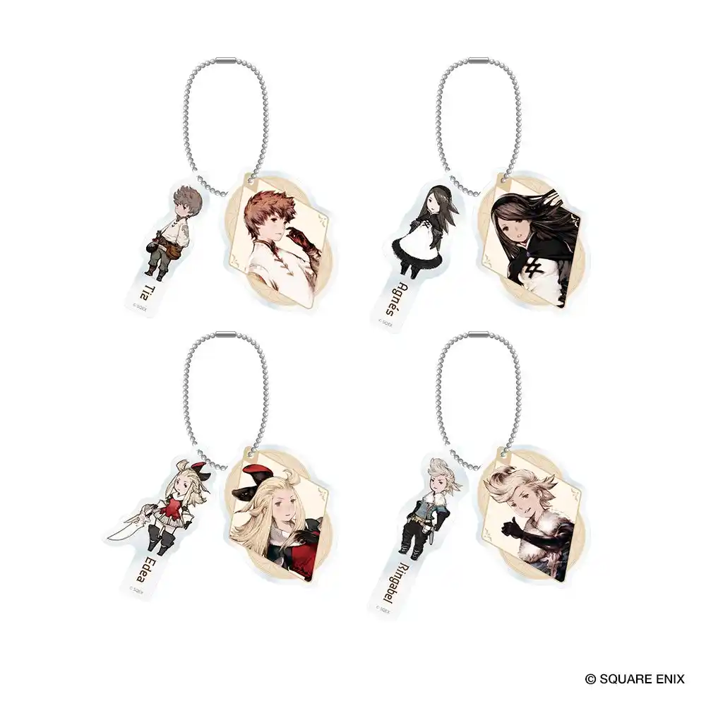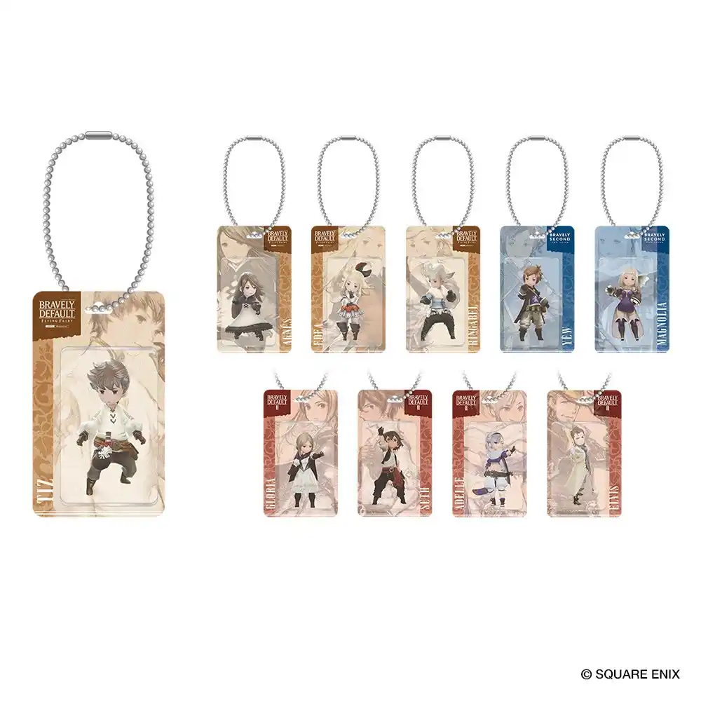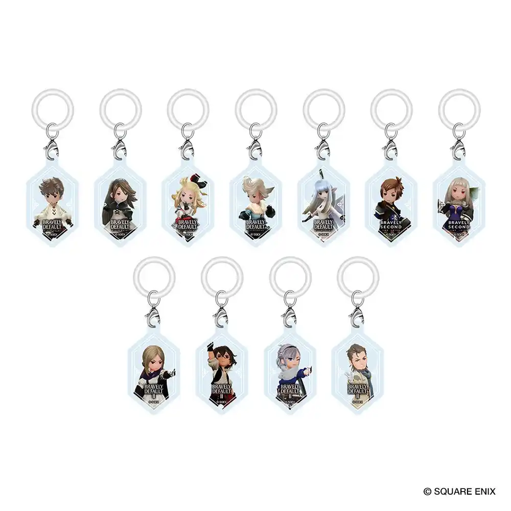 立体感のある2層構造を採用し、フィギュアパッケージのように見える新感覚のキーホルダー。透明感のあるアクリル越しに覗くキャラクターが、存在感のある佇まいを演出します。『ブレイブリーデフォルト』の主人公たち4人に加え、『ブレイブリーセカンド エンドレイヤー』からユウとマグノリア、『ブレイブリーデフォルトII』からセスたち4人の主人公をラインナップしました。 |