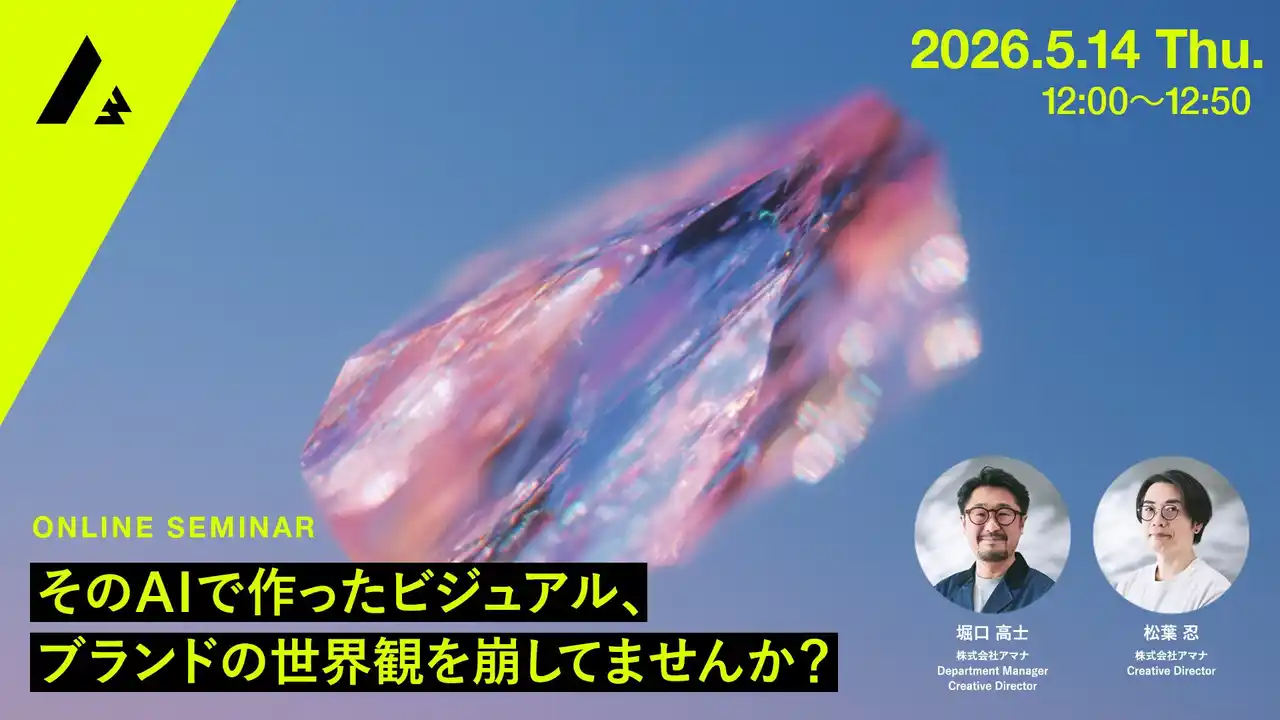 コミュニケーション変革をクリエイティブで実現する株式会社アマナ(本社:東京都品川区、代表取締役社長:金子剛章、以下「アマナ」)は、2026年5月14日(木)、「そのAIで作ったビジュアル、ブランドの世界観を崩してませんか?」をテーマにオンラインセミナーを開催します。 |