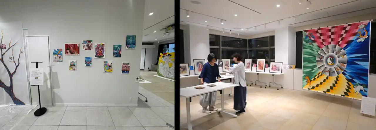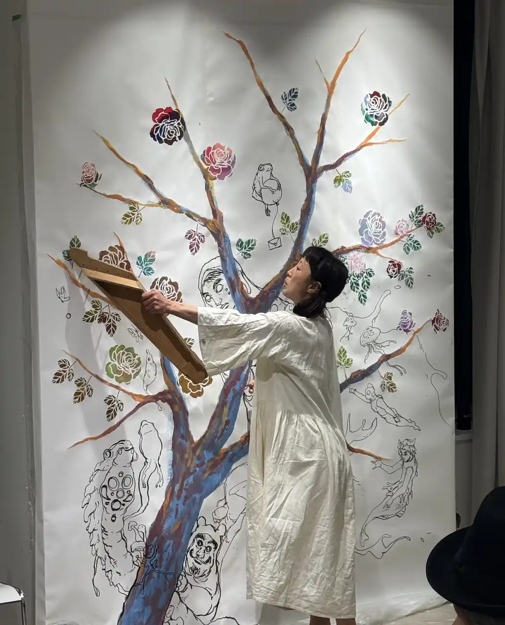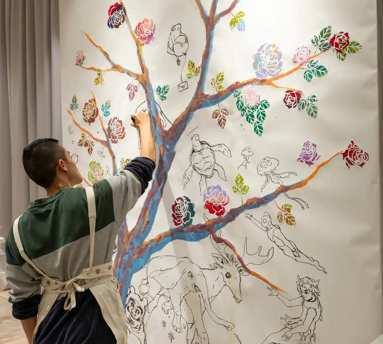 イベントにはプロジェクトに興味を持つ来場者約100人が集まりました。トークイベント前には、漫画家のおぐりちはやさんのライブペイントが行われました。おぐりさんは「ワイルドローズ」の木や幹を描き、貝印社員や参加者がステンシルの手法で花を咲かせました。この「ワイルドローズ」は、2017年におぐりさんがラダックの公立学校で生徒たちと完成させた壁画で、9年ぶりの修復を予定しています。また、同じ壁面には次々と不思議な生き物が遊泳するように描かれ、ラダックの芸術祭の様子を彷彿させました。インドのスパイスを効かせたチャイやラダックの伝統食の春雨カレー「ピン」を楽しみながらの鑑賞となりました。 |