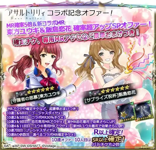 本コラボレーションの開催を記念して、MR確率5倍&コラボMR東方ユウキ&飯島恋花確率超アップとなるスペシャルオファーをご用意しております。さらに、10連オファーを実行するごとに豪華なおまけも獲得できます。コラボレーションならではの特別な機会となっておりますので、この機会にぜひお楽しみください。 |