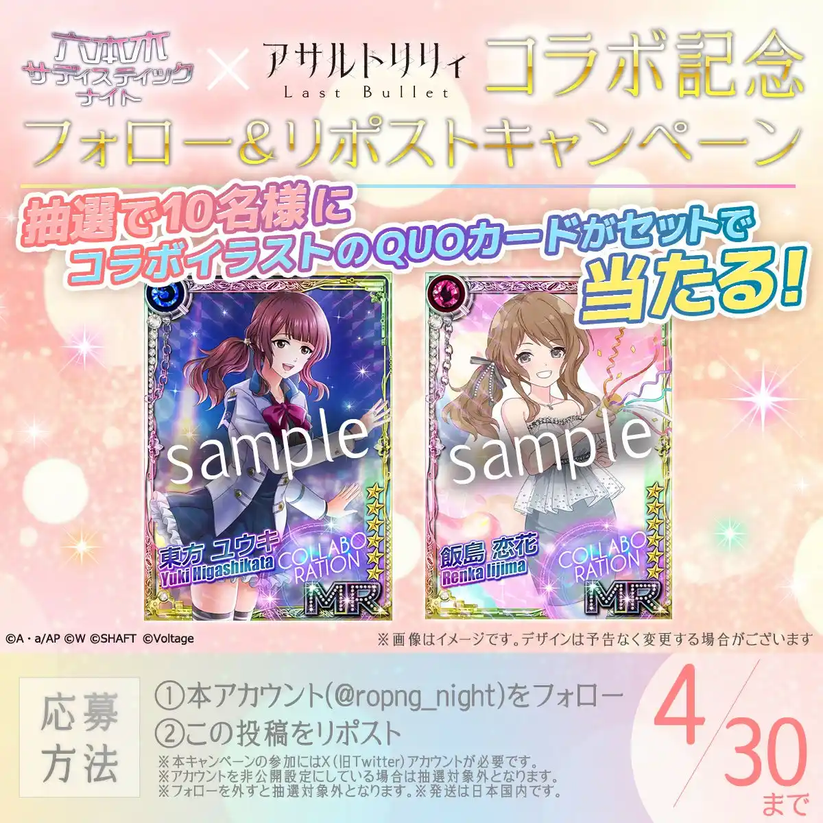 本企画では、「アサルトリリィ Last Bullet」とのコラボガチャを開催いたします。コラボ衣装を身にまとった「アサルトリリィ Last Bullet」の「飯島恋花」と、「六本木サディスティックナイト」の「東方ユウキ」が、描きおろしの限定カードとして登場いたします。さらに、本コラボカードには、人気声優・石飛恵里花の録りおろしボイスを収録しております。ここでしか手に入らない特別なカードを、ぜひお楽しみください。 |