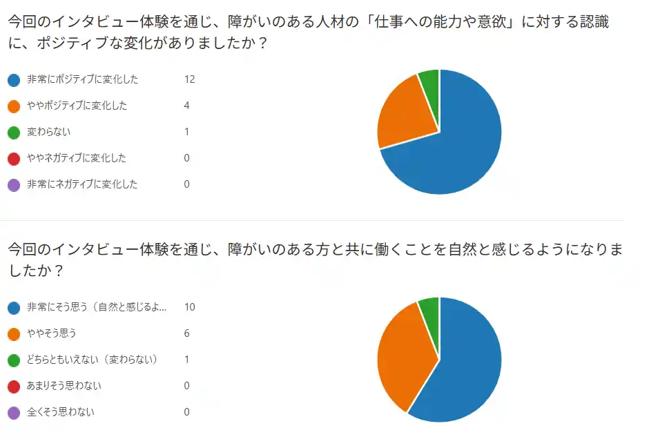 実証に参加した社員17名中16名が、障害者人材の「仕事への能力・意欲」への認識がポジティブに変化。全員が「障害者人材と共に働きたい」と回答しました(「非常にそう思う」10名、「ややそう思う」6名)。 |
