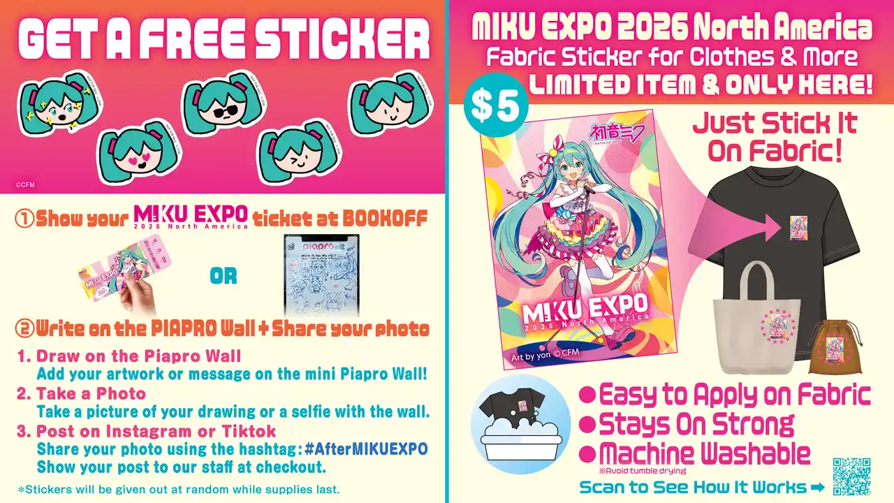 4.イベント限定グッズの販売 「HATSUNE MIKU EXPO 2026 North America」連動の限定グッズに加え、イベント限定アパレルステッカーを店頭で販売予定です。 |
