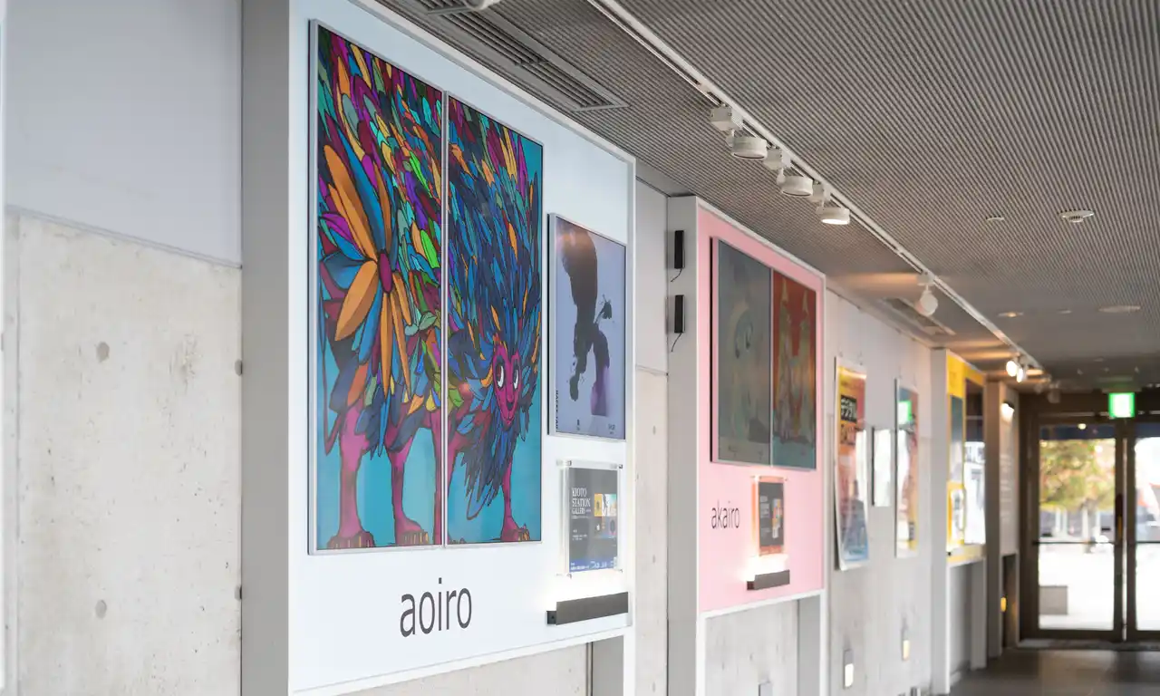 京都駅ビル7階東広場通路スペースに設置しているKYOTO STATION GALLERYでは、aoiro、akairo、kiiroの3ブースにアート専用のデジタル額縁を設置しており、サイズに合わせてキュレーションした30作品を展示します。 |