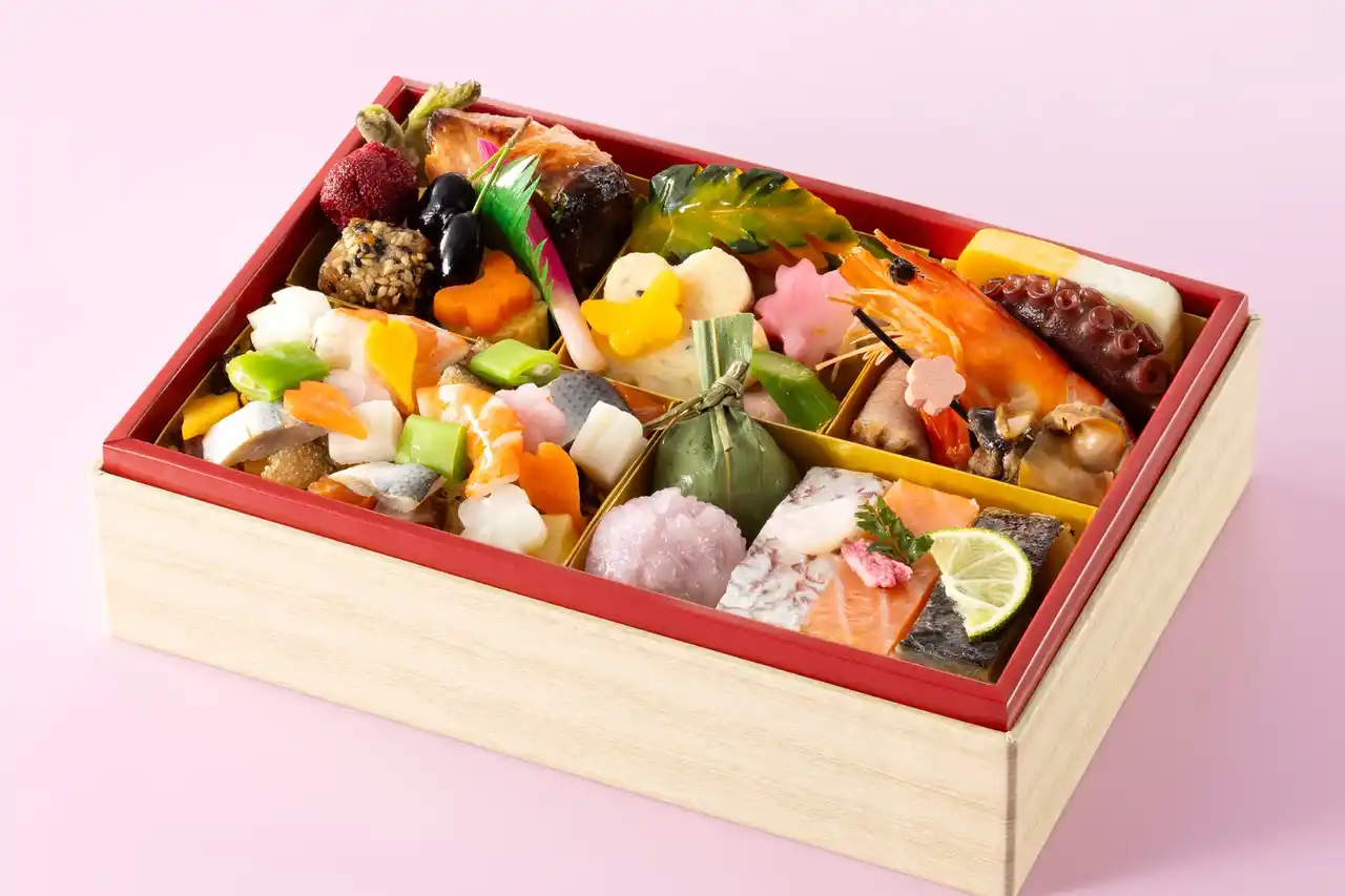 一の重には、多彩な美味しさ。二の重には、金粉をあしらったちらし寿司。目にも華やかな味わいをお愉しみいただけます。 |